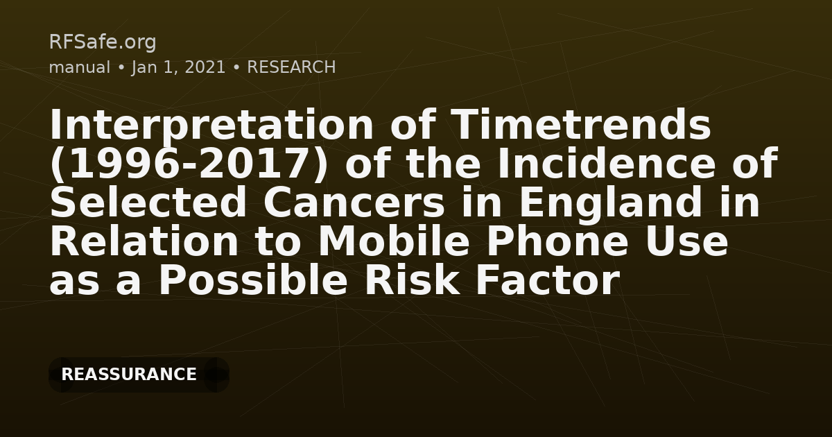 "linkedin": "This ecological time-trend paper analyzes England cancer incidence data (1996–2017) and interprets trends in relation to mobile phone RF exposure. It reports little evidence of association for brain and parotid gland cancers and characterizes hypothesized associations with thyroid and colorectal cancer as weak, while noting that ecological data cannot fully exclude contributions and that ongoing monitoring remains important."