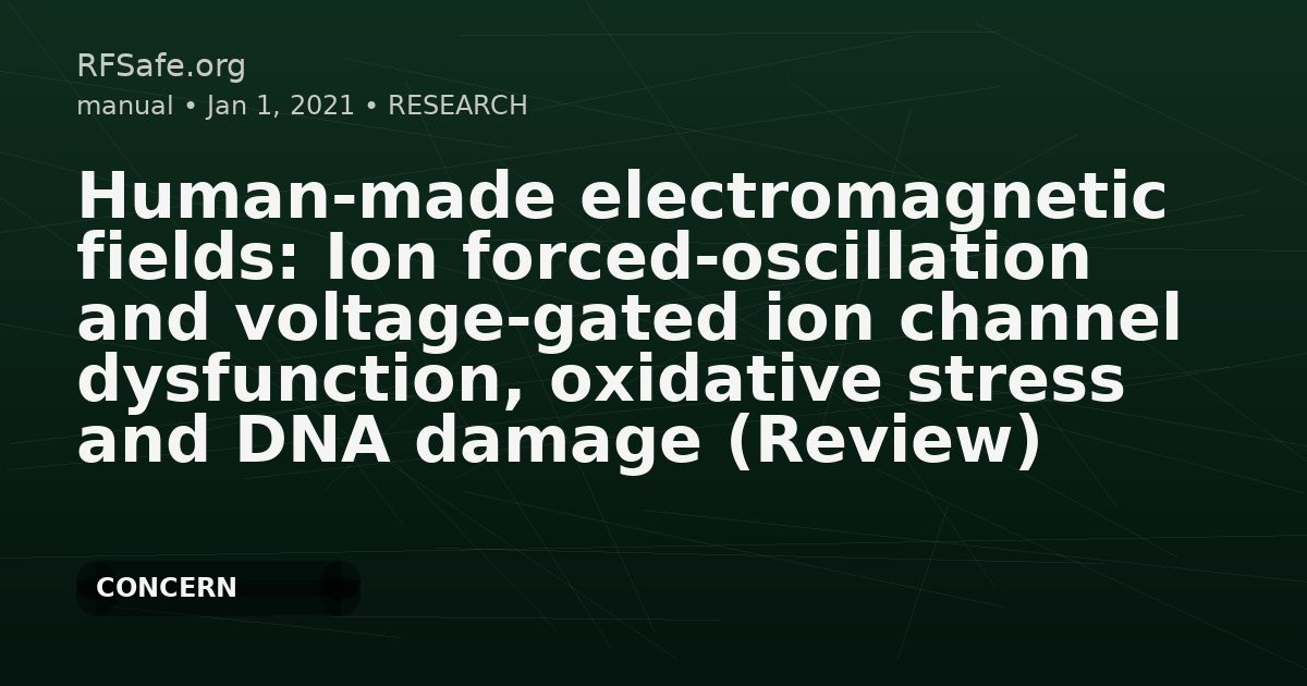 Human-made electromagnetic fields: Ion forced-oscillation and voltage-gated ion channel dysfunction, oxidative stress and DNA damage (Review) Dimitris J Panagopoulos, Andreas Karabarbounis, Igor Yakymenko, George P Chrousos. Human-made electromagnetic fields: Ion forced-oscillation and voltage-gated ion channel dysfunction, oxidative stress and DNA damage (Review). Int J Oncol. 2021 Nov;59(5):92. doi: 10.3892/ijo.2021.5272. Abstract Exposure of animals/biological samples to human-made electromagnetic fields (EMFs), especially in the extremely low frequency (ELF) band, and the microwave/radio frequency (RF) band which is always combined with ELF, may lead to DNA damage. DNA damage is connected with cell death, infertility and other pathologies, including cancer. ELF exposure from high-voltage power lines and complex RF exposure from wireless communication antennas/devices are linked to increased cancer risk. Almost all human-made RF EMFs include ELF components in the form of modulation, pulsing and random variability. Thus, in addition to polarization and coherence, the existence of ELFs is a common feature of almost all human-made EMFs. The present study reviews the DNA damage and related effects induced by human-made EMFs. The ion forced-oscillation mechanism for irregular gating of voltage-gated ion channels on cell membranes by polarized/coherent EMFs is extensively described. Dysfunction of ion channels disrupts intracellular ionic concentrations, which determine the cell's electrochemical balance and homeostasis. The present study shows how this can result in DNA damage through reactive oxygen species/free radical overproduction. Thus, a complete picture is provided of how human-made EMF exposure may indeed lead to DNA damage and related pathologies, including cancer. Moreover, it is suggested that the non-thermal biological effects attributed to RF EMFs are actually due to their ELF components. Open access paper: spandidos-publications.com