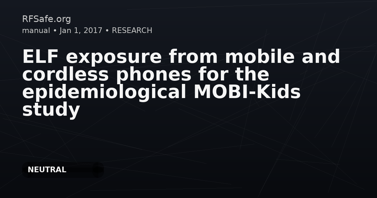 - ELF exposure from mobile and cordless phones for the epidemiological MOBI-Kids study Calderón C, Ichikawa H, Taki M, Wake K, Addison D, Mee T, Maslanyj M, Kromhout H, Lee AK, Sim MR, Wiart J, Cardis E. ELF exposure from mobile and cordless phones for the epidemiological MOBI-Kids study. Environ Int. 2017 Jan 23. pii: S0160-4120(17)30047-8. doi: 10.1016/j.envint.2017.01.005. Abstract This paper describes measurements and computational modelling carried out in the MOBI-Kids case-control study to assess the extremely low frequency (ELF) exposure of the brain from use of mobile and cordless phones. Four different communication systems were investigated: Global System for Mobile (GSM), Universal Mobile Telecommunications System (UMTS), Digital Enhanced Cordless Telecommunications (DECT) and Wi-Fi Voice over Internet Protocol (VoIP). The magnetic fields produced by the phones during transmission were measured under controlled laboratory conditions, and an equivalent loop was fitted to the data to produce three-dimensional extrapolations of the field. Computational modelling was then used to calculate the induced current density and electric field strength in the brain resulting from exposure to these magnetic fields. Human voxel phantoms of four different ages were used: 8, 11, 14 and adult. The results indicate that the current densities induced in the brain during DECT calls are likely to be an order of magnitude lower than those generated during GSM calls but over twice that during UMTS calls. The average current density during Wi-Fi VoIP calls was found to be lower than for UMTS by 30%, but the variability across the samples investigated was high. Spectral contributions were important to consider in relation to current density, particularly for DECT phones. This study suggests that the spatial distribution of the ELF induced current densities in brain tissues is determined by the physical characteristics of the phone (in particular battery position) while the amplitude is mainly dependent on communication system, thus providing a feasible basis for assessing ELF exposure in the epidemiological study. The number of phantoms was not large enough to provide definitive evidence of an increase of induced current density with age, but the data that are available suggest that, if present, the effect is likely to be very small. ncbi.nlm.nih.gov Also see: saferemr.com