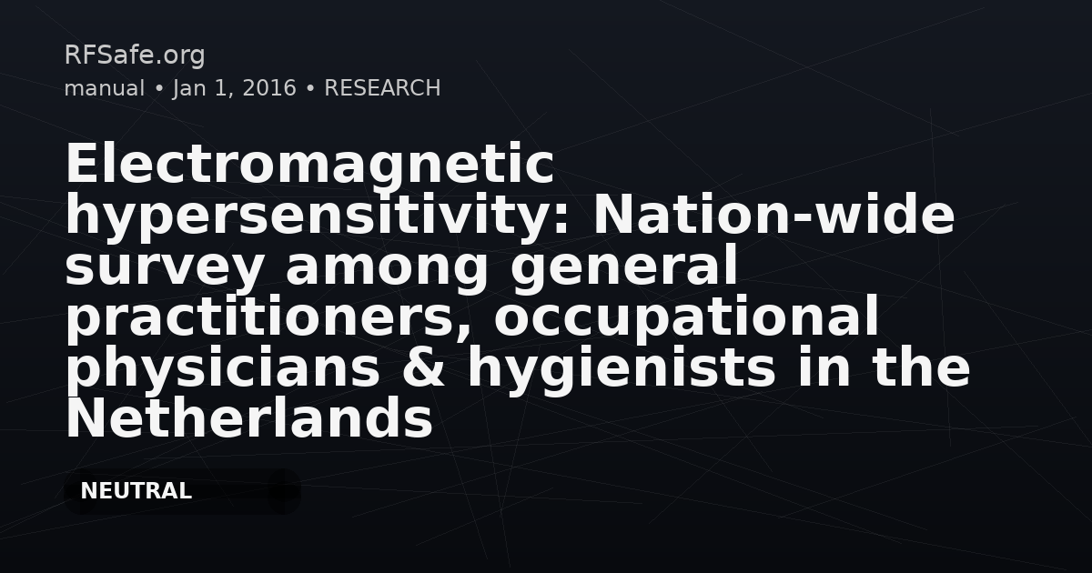 Electromagnetic hypersensitivity: Nation-wide survey among general practitioners, occupational physicians & hygienists in the Netherlands Slottje P, van Moorselaar I, van Strien R, Vermeulen R, Kromhout H, Huss A. Electromagnetic hypersensitivity (EHS) in occupational and primary health care: A nation-wide survey among general practitioners, occupational physicians and hygienists in the Netherlands. Int J Hyg Environ Health. 2016 Dec 2. pii: S1438-4639(16)30385-6. doi: 10.1016/j.ijheh.2016.11.013. Abstract Subjects who attribute health complaints to every day levels of non-ionizing electromagnetic fields (EMF) have been referred to as electrohypersensitive (EHS). Previous surveys in Europe showed that 68-75% of general practitioners had ever been consulted on EHS. Given the lack of data on EHS in the Netherlands in the general population and on EHS in occupational settings, we performed a national survey among three professional groups that are likely in the first line of being consulted by EHS individuals. Results show that about one third of occupational hygienists, occupational physicians and general practitioners had ever been consulted by one or more EHS subjects. Many of these professionals considered a causal relationship between EMF and health complaints to some degree plausible, and their approach often included exposure reduction advice. Given the lack of scientific evidence for EHS and how low level EMF exposure could cause reported health complaints and given the finding that the majority of these professionals felt insufficiently informed about EMF and health, targeted information campaigns might assist them in their evidence based dealing with subjects who attribute symptoms to EMF. Conclusions About a third of occupational hygienist, occupational physicians and general practitioners in the Netherlands are consulted by patients attributing symptoms to EMF exposure. Many of these professionals consider a causal relationship between EMF and health complaints to some degree plausible, and their approach often also includes exposure reduction advice. Given the lack of a scientific evidence basis for EMF to cause symptoms and the finding that the majority of these professionals feels insufficiently informed about EMF and health, targeted information campaigns might assist them in their evidence based dealing with patients who attribute symptoms to EMF. sciencedirect.com