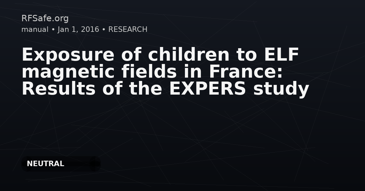 Exposure of children to ELF magnetic fields in France: Results of the EXPERS study Magne I, Souques M, Bureau I, Duburcq A, Remy E, Lambrozo J. Exposure of children to extremely low frequency magnetic fields in France: Results of the EXPERS study. J Expo Sci Environ Epidemiol. 2016 Nov 9. doi: 10.1038/jes.2016.59. Abstract The assessment of magnetic field exposure in children is an important point in the context of epidemiological issues. EXPERS is the first study ever carried out measuring personal exposure to extremely low frequency magnetic fields at a national scale, involving 977 French children with 24 h personal measurements. Descriptive statistical analyses were performed for all the children, and only for children where no alarm clock was identified, as in some cases this requirement of the measurement protocol was not respected. The proportion of children with a 24 h arithmetic mean of ≥0.4 μT was 3.1% when considering all children and 0.8% when excluding alarm clocks. The alarm clocks were the main variable linked to the child exposure measurements. Magnetic field exposure increased when the home was located close to a high voltage power line. However, none of the 0.8% of children living at <125 m to a 225 kV line or <200 m to a 400 kV overhead line had a personal exposure of >0.4 μT. A multiple correspondence analysis showed the difficulty to build a statistical model predicting child exposure. The distribution of child personal exposure was significantly different from the distribution of exposure during sleep, questioning the exposure assessment in some epidemiological studies. ncbi.nlm.nih.gov Conclusion The EXPERS study is the first study of magnetic field personal exposure of children, with a significant number of subjects, at the scale of a country. It is also the first study on this subject in France. We looked for a relationship between the subjects' characteristics and their exposure, and observed differences depending on the indicator chosen (AM, GM or median). We studied the AM in more detail and found a strong correlation between the highest exposures and alarm clocks because of non-respect of the measurement protocol. That is why we performed two analyses, one over all the children, and one over the children for whom no alarm clock was identified on the magnetic field measurements during the night. The proportion of children with an AM ≥0.4 μT was 3.1% when considering all children and 0.8% when excluding those with alarm clocks. The magnetic field exposure was found to be correlated and increased when the home was located close to a 63 to 400 kV overhead line. However, few children were concerned and none of them had a personal exposure of >0.4 μT. On the contrary, the magnetic field exposure was found to be correlated and decreased when the home was located close to a MV overhead line. We hypothesize that this result is an artifact, because these grids are mainly found in rural areas, and the exposure was inversely correlated with the size of urban areas. We looked for correlations between the 24 h exposure (AM, GM and median). Excepted the alarm clocks, no other variable was significantly linked to the child exposure. This result was confirmed by a multiple correspondence analysis that showed that it would be difficult to build a model to predict the child exposure from the collected variables. The distribution of the 24 h AM, which is the personal exposure of children, was found to be significantly different from the distribution of the AM during the sleep of children, or of the TWA that was calculated from AM during sleep and school periods. This result questions the exposure assessment in some epidemiological studies. The same work will be done for the adults of the EXPERS study. More detailed focus will be done for electric grids.
