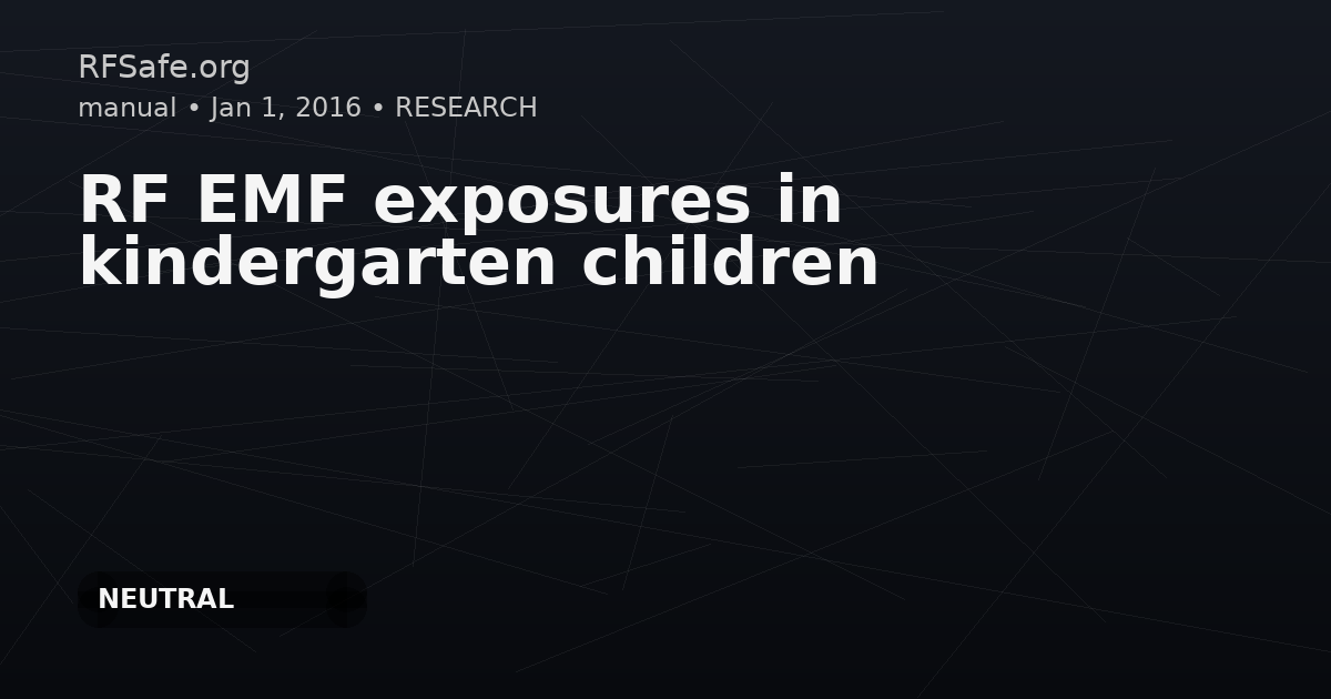 RF EMF exposures in kindergarten children Bhatt CR, Redmayne M, Billah B, Abramson MJ, Benke G.Radiofrequency-electromagnetic field exposures in kindergarten children.J Expo Sci Environ Epidemiol. 2016 Oct 19. doi: 10.1038/jes.2016.55. Abstract The aim of this study was to assess environmental and personal radiofrequency-electromagnetic field (RF-EMF) exposures in kindergarten children. Ten children and 20 kindergartens in Melbourne, Australia participated in personal and environmental exposure measurements, respectively. Order statistics of RF-EMF exposures were computed for 16 frequency bands between 88 MHz and 5.8 GHz. Of the 16 bands, the three highest sources of environmental RF-EMF exposures were: Global System for Mobile Communications (GSM) 900 MHz downlink (82 mV/m); Universal Mobile Telecommunications System (UMTS) 2100MHz downlink (51 mV/m); and GSM 900 MHz uplink (45 mV/m). Similarly, the three highest personal exposure sources were: GSM 900 MHz downlink (50 mV/m); UMTS 2100 MHz downlink, GSM 900 MHz uplink and GSM 1800 MHz downlink (20 mV/m); and Frequency Modulation radio, Wi-Fi 2.4 GHz and Digital Video Broadcasting-Terrestrial (10 mV/m). The median environmental exposures were: 179 mV/m (total all bands), 123 mV/m (total mobile phone base station downlinks), 46 mV/m (total mobile phone base station uplinks), and 16 mV/m (Wi-Fi 2.4 GHz). Similarly, the median personal exposures were: 81 mV/m (total all bands), 62 mV/m (total mobile phone base station downlinks), 21 mV/m (total mobile phone base station uplinks), and 9 mV/m (Wi-Fi 2.4 GHz). The measurements showed that environmental RF-EMF exposure levels exceeded the personal RF-EMF exposure levels at kindergartens. ncbi.nlm.nih.gov Excerpt In conclusion, this study provides evidence to support that of the 16 frequency bands measured the mobile phone base station DL exposure of GSM 900 MHz is the largest contributor to the total environmental and personal RF-EMF exposures in kindergartens in Melbourne. Wi-Fi exposure was found to be very low compared with mobile phone base station exposure. Environmental exposure levels at kindergartens located <300 m away from the nearest base station were higher compared with those located >300 m. The measurements suggested that the personal RF-EMF exposure levels were lower compared with the environmental RF-EMF levels at kindergartens.