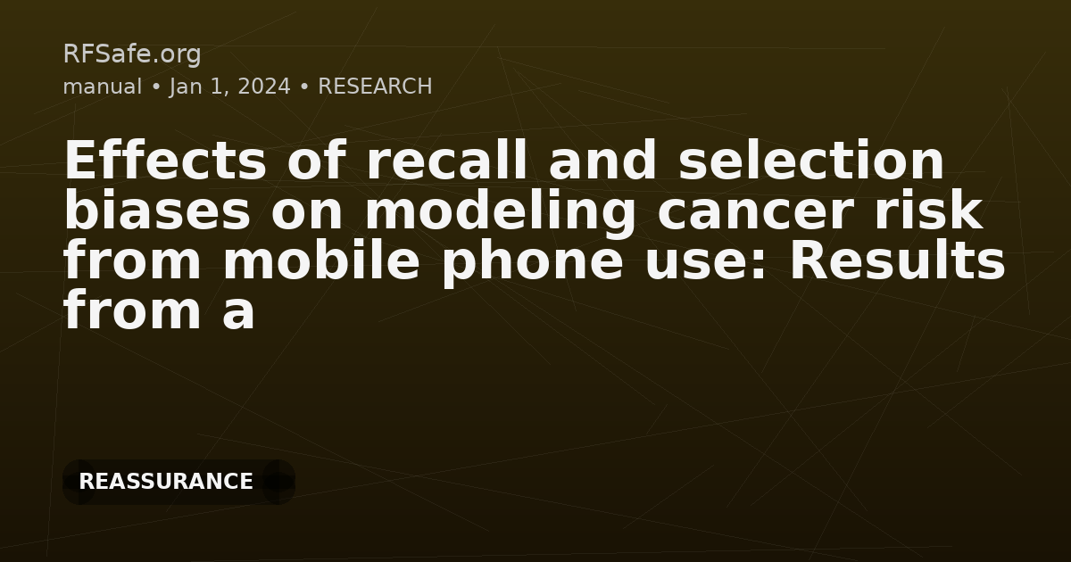 Effects of recall and selection biases on modeling cancer risk from mobile phone use: Results from a case-control simulation study (My note: The models tested in this simulation study were based on questionable assumptions.) Bouaoun L, Byrnes G, Lagorio S, Feychting M, Abou-Bakre A, Beranger R, Schüz J. Effects of recall and selection biases on modeling cancer risk from mobile phone use: Results from a case-control simulation study. Epidemiology. 2024 May 20. doi: 10.1097/EDE.0000000000001749. Abstract Background: The largest case-control study (Interphone Study) investigating glioma risk related to mobile phone use showed a J-shaped relationship with reduced relative risks for moderate use and a 40% increased relative risk among the 10% heaviest regular mobile phone users, using a categorical risk model based on deciles of lifetime duration of use among ever regular users. Methods: We conducted Monte-Carlo simulations examining whether the reported estimates are compatible with an assumption of no effect of mobile phone use on glioma risk when the various forms of biases present in the Interphone study are accounted for. Four scenarios of sources of error in self- reported mobile phone use were considered, along with selection bias. Input parameters used for simulations were those obtained from Interphone validation studies on reporting accuracy and from using a non-response questionnaire. Results: We found that the scenario simultaneously modeling systematic and random reporting errors produced a J-shaped relationship perfectly compatible with the observed relationship from the main Interphone study with a simulated spurious increased relative risk among heaviest users (OR = 1.91) compared to never regular users. The main determinant for producing this J shape was higher reporting error variance in cases compared to controls, as observed in the validation studies. Selection bias contributed to the reduced risks as well. Conclusions: Some uncertainty remains, but the evidence from the present simulation study shifts the overall assessment to making it less likely that heavy mobile phone use is causally related to an increased glioma risk. Open access paper: pubmed.ncbi.nlm.nih.gov