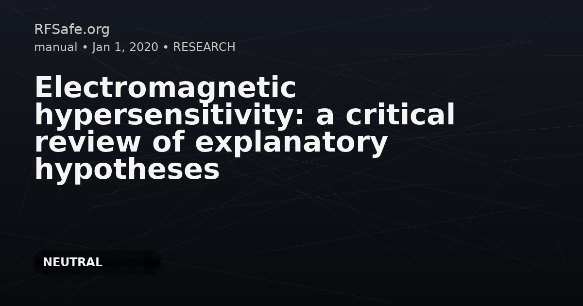 Electromagnetic hypersensitivity: a critical review of explanatory hypotheses Dieudonné M. Electromagnetic hypersensitivity: a critical review of explanatory hypotheses. Environ Health. 2020 May 6;19(1):48. doi: 10.1186/s12940-020-00602-0. Abstract BACKGROUND: Electromagnetic hypersensitivity (EHS) is a condition defined by the attribution of non-specific symptoms to electromagnetic fields (EMF) of anthropogenic origin. Despite its repercussions on the lives of its sufferers, and its potential to become a significant public health issue, it remains of a contested nature. Different hypotheses have been proposed to explain the origin of symptoms experienced by self-declared EHS persons, which this article aims to review. METHODS: As EHS is a multi-dimensional problem, and its explanatory hypotheses have far-reaching implications, a broad view was adopted, not restricted to EHS literature but encompassing all relevant bodies of research on related topics. This could only be achieved through a narrative approach. Two strategies were used to identify pertinent references. Concerning EHS, a complete bibliography was extracted from a 2018 report from the French Agency for Food, Environmental and Occupational Health & Safety and updated with more recent studies. Concerning related topics, the appropriate databases were searched. Systematic reviews and expert reports were favored when available. FINDINGS: Three main explanatory hypotheses appear in the literature: (1) the electromagnetic hypothesis, attributing EHS to EMF exposure; (2) the cognitive hypothesis, assuming that EHS results from false beliefs in EMF harmfulness, promoting nocebo responses to perceived EMF exposure; (3) the attributive hypothesis, conceiving EHS as a coping strategy for pre-existing conditions. These hypotheses are successively assessed, considering both their strengths and limitations, by comparing their theoretical, experimental, and ecological value. CONCLUSION: No hypothesis proves totally satisfying. Avenues of research are suggested to help decide between them and reach a better understanding of EHS. Open access paper: ncbi.nlm.nih.gov