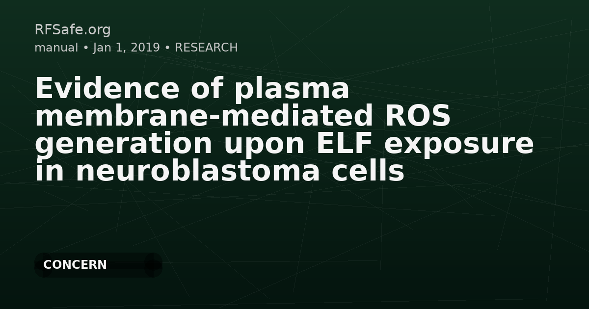 Evidence of plasma membrane-mediated ROS generation upon ELF exposure in neuroblastoma cells Merla C, Liberti M, Consales C, Denzi A, Apollonio F, Marino C, Benassi B. Evidences of plasma membrane- mediated ROS generation upon ELF exposure in neuroblastoma cells. Biochim Biophys Acta Biomembr. 2019 Jun 11. pii: S0005-2736(19)30137-3. doi: 10.1016/j.bbamem.2019.06.005. Abstract BACKGROUND: Molecular mechanisms of interaction between cells and extremely low frequency magnetic fields (ELF-MFs) still represent a matter of scientific debate. In this paper, to identify the possible primary source of oxidative stress induced by ELF-MF in SH-SY5Y human neuroblastoma cells, we estimated the induced electric field and current density at the cell level. METHODS: We followed a computational multiscale approach, estimating the local electric field and current density from the whole sample down to the single cell level. The procedure takes into account morphological modeling of SH-SY5Y cells, arranged in different topologies. Experimental validation has been carried out: neuroblastoma cells have been treated with Diphenyleneiodonium (DPI) -an inhibitor of the plasma membrane enzyme NADPH oxidase (Nox)- administered 24 h before exposure to 50 Hz (1 mT) MF. RESULTS: Macroscopic and microscopic dosimetric evaluations suggest that increased current densities are induced at the plasma membrane/extra-cellular medium interface; identifying the plasma membrane as the main site of the ELF-neuroblastoma cell interaction. The in vitro results provide an experimental proof that plasma membrane Nox exerts a key role in the redox imbalance elicited by ELF, as DPI treatment reverts the generation of reactive oxygen species induced by ELF exposure. GENERAL SIGNIFICANCE: Microscopic current densities induced at the plasma membrane are likely to play an active physical role in eliciting ELF effects related to redox imbalance. Multiscale computational dosimetry, supported by an in vitro approach for validation, is proposed as the innovative and rigorous paradigm to unveil mechanisms underlying the complex ELF-MF interactions. ncbi.nlm.nih.gov
