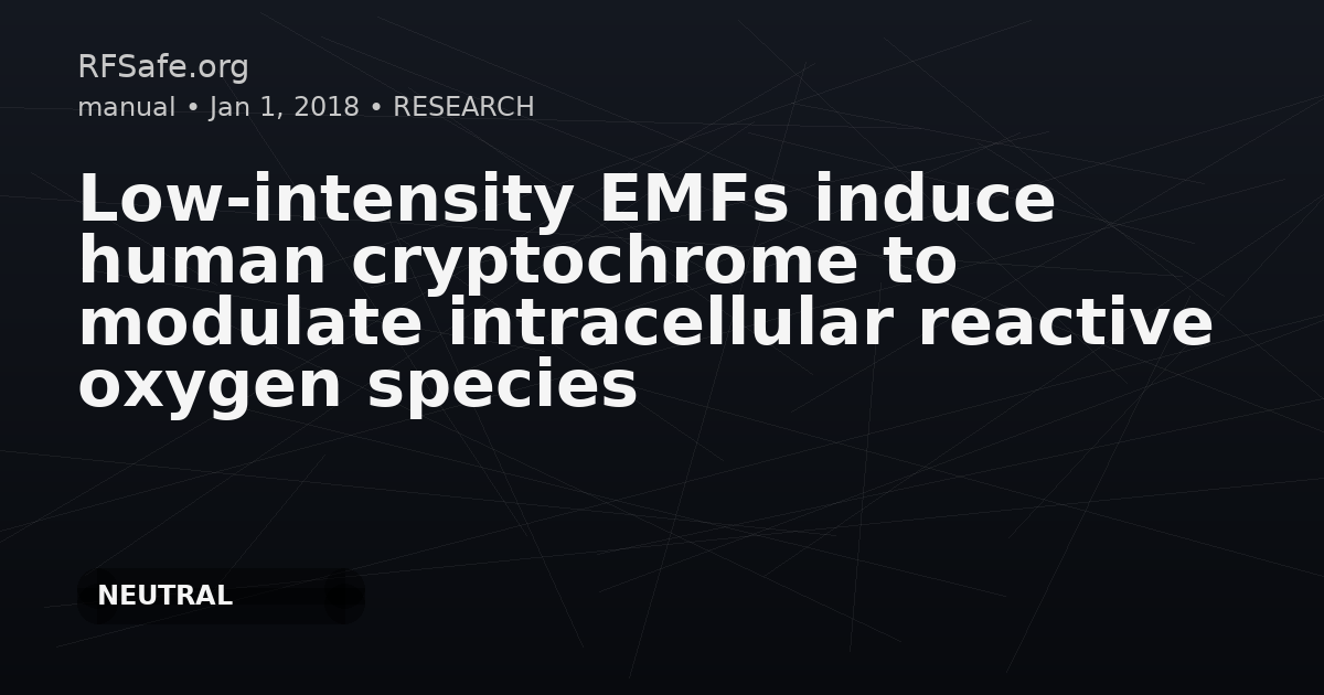 Low-intensity EMFs induce human cryptochrome to modulate intracellular reactive oxygen species Sherrard RM, Morellini N, Jourdan N, El-Esawi M, Arthaut LD, Niessner C, Rouyer F, Klarsfeld A, Doulazmi M, Witczak J, d'Harlingue A, Mariani J, Mclure I, Martino CF, Ahmad M. Low-intensity electromagnetic fields induce human cryptochrome to modulate intracellular reactive oxygen species. PLoS Biol. 2018 Oct 2;16(10):e2006229. doi: 10.1371/journal.pbio.2006229. Abstract Exposure to man-made electromagnetic fields (EMFs), which increasingly pollute our environment, have consequences for human health about which there is continuing ignorance and debate. Whereas there is considerable ongoing concern about their harmful effects, magnetic fields are at the same time being applied as therapeutic tools in regenerative medicine, oncology, orthopedics, and neurology. This paradox cannot be resolved until the cellular mechanisms underlying such effects are identified. Here, we show by biochemical and imaging experiments that exposure of mammalian cells to weak pulsed electromagnetic fields (PEMFs) stimulates rapid accumulation of reactive oxygen species (ROS), a potentially toxic metabolite with multiple roles in stress response and cellular ageing. Following exposure to PEMF, cell growth is slowed, and ROS- responsive genes are induced. These effects require the presence of cryptochrome, a putative magnetosensor that synthesizes ROS. We conclude that modulation of intracellular ROS via cryptochromes represents a general response to weak EMFs, which can account for either therapeutic or pathological effects depending on exposure. Clinically, our findings provide a rationale to optimize low field magnetic stimulation for novel therapeutic applications while warning against the possibility of harmful synergistic effects with environmental agents that further increase intracellular ROS. Author summary Repetitive low-intensity magnetic stimulation has been used in the treatment of disease for over 50 years. Associated benefits have included alleviation of depression, memory loss, and symptoms of Parkinson disease, as well as accelerated bone and wound healing and the treatment of certain cancers, independently of surgery or drugs. However, the cellular mechanisms underlying these effects remain unclear. Here, we demonstrate that repetitive magnetic field exposure in human cells stimulates production of biological stress response chemicals known as reactive oxygen species (ROS). At moderate doses, we find that reactive oxygen actively stimulates cellular repair and stress response pathways, which might account for the observed therapeutic effects to repetitive magnetic stimulation. We further show that this response requires the function of a well- characterized, evolutionarily conserved flavoprotein receptor known as cryptochrome, which has been implicated in magnetic sensing in organisms ranging from plants to flies, including migratory birds. We conclude that exposure to weak magnetic fields induces the production of ROS in human cells and that this process requires the presence of the cryptochrome receptor. Editor's Note: This Short Report received positive reviews by experts. The Academic Editor has written an accompanying Primer that we are publishing alongside this article (doi.org). The linked Primer presents a complementary expert perspective; it discusses considerations about the status of knowledge and experimental systems in the field that encourage cautious interpretation. Open access paper: journals.plos.org