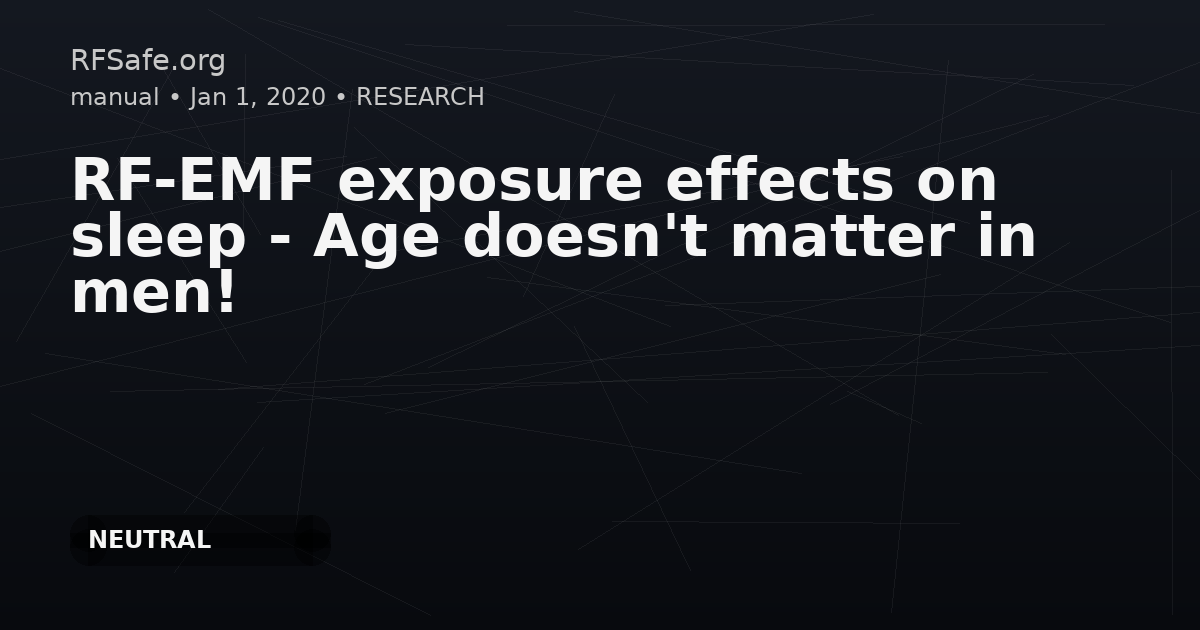 RF-EMF exposure effects on sleep - Age doesn't matter in men! Torsten Eggert, Hans Dorn, Cornelia Sauter, Gernot Schmid, Heidi Danker-Hopfe. RF-EMF exposure effects on sleep - Age doesn't matter in men! Environ Res. 2020 Sep 12;110173. doi: 10.1016/j.envres.2020.110173. Abstract Background: Although there are several human experimental studies on short-term effects of radiofrequency electromagnetic fields (RF-EMF) on sleep, the role of effect modification by sex or age in this context has not yet been considered. In an earlier study, we observed sex differences in RF-EMF effects in elderly subjects. The present study investigated possible RF-EMF effect modifications by age in men. Methods: Data available for the present analysis come from three double-blind, randomized cross-over studies, in which effects of different RF-EMF exposure signals on sleep were investigated in young [sample 1: 25.3 (mean) ± 2.6 (SD) years; sample 2: 25.4 ± 2.6 years; n=30, respectively] and older (69.1 ± 5.5 years; n=30) healthy male volunteers. Studies comprised a screening/adaptation night followed by nine experimental nights at two- week intervals. RF-EMF exposure effect modifications by age were analysed for two different exposure signals (GSM900 at 2 W/kg, TETRA at 6 W/kg), each compared to a sham exposure. Polysomnography, during which the exposure signals were delivered by a head worn antenna, as well as sleep staging were performed according to the AASM standard. Four subjective and 30 objective sleep parameters were statistically analysed related to possible RF-EMF effects. Results: Comparisons of sleep parameters observed under sham exposure revealed highly pronounced physiological differences between young and elderly men. A consistent exposure effect in both age groups was found for a shorter latency to persistent sleep under TETRA exposure reflecting a sleep-promoting effect. Exposure effect modifications by age were observed for two of the four self-reported sleep parameters following GSM900 exposure and for arousals during REM sleep under TETRA exposure. Conclusions: As effects of a short-term all-night RF-EMF exposure on sleep occurred only sporadically in young and elderly men, it seems that age doesn't matter in this respect. However, as long as there are no corresponding data from young healthy women that would allow a comparison with the data from elderly women, this assumption cannot be conclusively verified. Nevertheless, the present results are not indicative of any adverse health effects. pubmed.ncbi.nlm.nih.gov