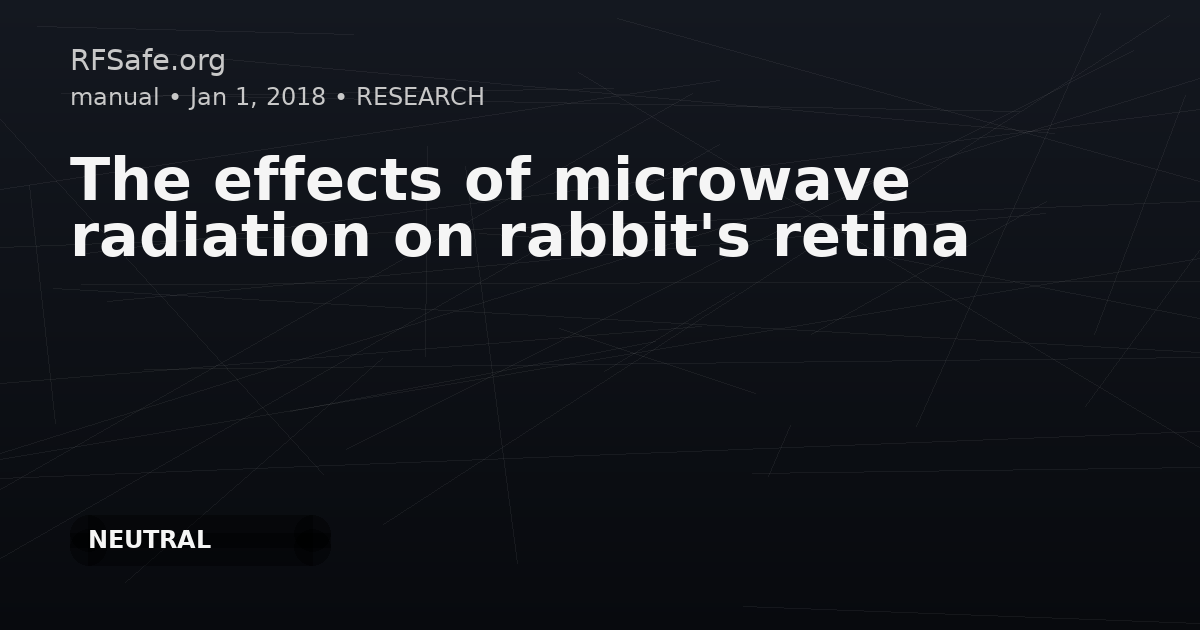 The effects of microwave radiation on rabbit's retina Mohammad R. Talebnejad MR,Sadeghi-Sarvestani A, Hossein Nowroozzadeh M, Mortazavi SMJ, Khalili MR.The effects of microwave radiation on rabbit's retina. Journal of Current Ophthalmology. 30(1):74-79. Mar 2018. Purpose Mobile cell phones are used extensively these days, and their microwave (MW) radiation has been shown to affect the eye. The purpose of the present study was to evaluate the effects of MW radiation on rabbit retina. Methods This experimental study (concluded in 2015) was conducted on 40 adult white New Zealand rabbits. A Global System for Mobile Communications (GSM) cell phone simulator was used for MW irradiation. The rabbits were randomized into five groups (8 in each) and treated as follows: Group 1: no irradiation (sham); Group 2: irradiation at 10 cm for 1 day; Group 3: irradiation at 30 cm for 1 day; Group 4: irradiation at 10 cm for 3 days; and Group 5: irradiation at 30 cm for 3 days. Scotopic and photopic electroretinography (ERG) responses were obtained at baseline and 7 days after the last exposure. Then all the rabbits were euthanized, and their eyes were enucleated and sent for pathology examination. Kruskal-Wallis and Chi-Square tests were used to evaluate intergroup differences in ERG parameters and histological findings, respectively. Results ERG responses obtained 7 days after irradiation did not show any statistically significant difference between the groups (P > 0.1, for all tested parameters). There were statistically non-significant trends toward greater changes in the MW irradiated eyes. In pathological examination, retina was normal with no sign of degeneration or infiltration. Ciliary body congestion was observed in greater fraction of those who received higher MW doses. (P = 0.005). Conclusions Histopathologically, cell phone simulated MW irradiation had no significant detrimental effect on the retina. However, ciliary body congestion was observed in greater fraction of those who received higher MW doses. Although there was no significant difference between post-treatment mean ERG values, there were statistically non-significant trends toward greater changes in the MW irradiated eyes. ac.els-cdn.com b681-a67c72fb8ce7&acdnat=1521759969_87729ccbd7b1a4e21078c03d443000be