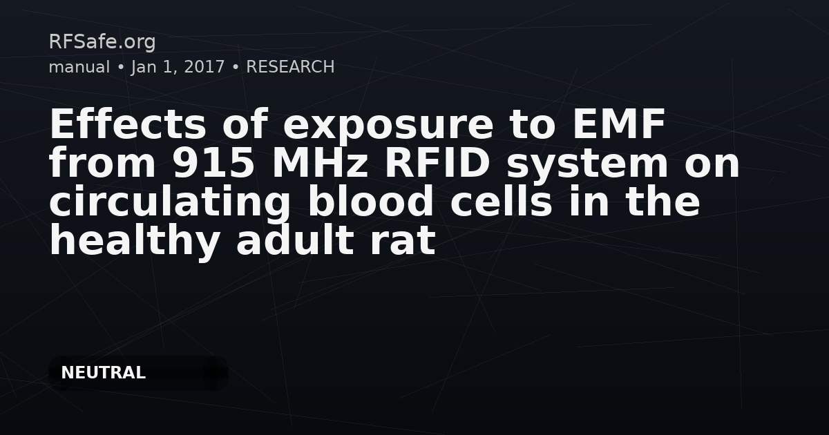 Effects of exposure to EMF from 915 MHz RFID system on circulating blood cells in the healthy adult rat Kim HS, Park JS, Jin YB, Do Choi H, Kwon JH, Pack JK, Kim N, Ahn YH. Effects of exposure to electromagnetic field from 915 MHz radiofrequency identification system on circulating blood cells in the healthy adult rat. Bioelectromagnetics. 2017 Nov 24. doi: 10.1002/bem.22093. Abstract We investigated whether exposure to the 915 MHz radiofrequency identification (RFID) signal affected circulating blood cells in rats. Sprague-Dawley rats were exposed to RFID at a whole-body specific absorption rate of 2 W/kg for 8 h per day, 5 days per week, for 2 weeks. Complete blood counts were performed after RFID exposure, and the CD4+ /CD8+ ratio was determined by flow cytometry. The number of red blood cells (RBCs) and the values of hemoglobin, hematocrit, and RBC indices were increased in the RFID-exposed group compared with those in the cage-control and sham-exposed groups (P < 0.05). However, the RBCs and platelet numbers were within normal physiologic response ranges. The number of white blood cells, including lymphocytes, was decreased in RFID-exposed rats. However, there was no statistically significant difference between the sham- exposed and RFID-exposed groups in terms of T-cell counts or CD4+ /CD8+. ncbi.nlm.nih.gov Excerpts A period of 2 weeks in rats corresponds to 1.5 years in human if calculated based on a human life expectancy of 80 years. 2 W/kg is about five times the occupational exposure limit 0.4 W/kg of ICNIRP/IEEE guidelines at the distance of 12 cm from RFID antenna. As RF-EMF exposure can affect body temperature, we measured rectal temperature before and after RFID exposure; no statistically significant changes in temperature were found in our exposure system .... ... although circulating blood cell counts were significantly affected by exposure to 915 MHz RFID at a whole- body SAR of 2 W/kg for 2 weeks, these changes do not necessarily indicate that RFID exposure is harmful, as values remained within normal physiological response ranges.