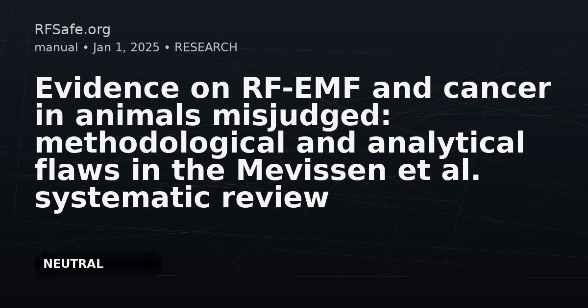 Category: Epidemiology Tags: RF-EMF, cancer, animal studies, systematic review, methodology, analytical flaws, health risk DOI: 10.1016/j.envint.2025.109961 URL: sciencedirect.com To the Editors, Environment International Re: Mevissen et al. Effects of radiofrequency electromagnetic field exposure on cancer in laboratory animal studies, a systematic review. The systematic review by Mevissen et al. (2025) evaluated 52 studies for evidence of a relationship between radiofrequency electromagnetic field (RF-EMF) exposure and cancer incidence as reported in animal studies. The review found no evidence of cancer in most biological systems but reported moderate certainty evidence for an association with lymphoma, liver, lung, and adrenal gland tumours, and high certainty evidence for an association with brain cancer (glioma) and heart cancer (malignant schwannoma) only in male rats. There are a number of serious flaws in the Mevissen et al. systematic review that relate specifically to the positive associations found with certain critical cancers and these flaws undermine their conclusions. 1. Inappropriate synthesis of results The systematic review conducted a high-quality search and identified all the appropriate studies, collating a large evidence base. One of the most important parts of a systematic review is the synthesis of results from this evidence base. Unfortunately, the authors of this systematic review elected not to consider the evidence in its totality and instead focused on a small number of positive findings. The review considered RF-EMF to have an effect on cancer if at least one study showed a significant effect (on exposed versus not-exposed) or significant trend (across different exposure levels) regardless of other studies not finding an effect or trend. This is explicitly stated in section 2.7 of the systematic review. Further, a trend could be calculated as statistically significant even if it was based on individual non-significant results across different exposure levels. This issue is demonstrated repeatedly in the Mevissen et al. review, most prominently in the assessment of brain tumours, lymphoma, and heart schwannomas. It is particularly egregious for glioma, with the authors purporting a high certainty of an increased risk of brain tumours. This is despite there being no single significant result across all studies, with the review’s reported outcome based on insignificant results from a single paper (NTP, 2018b) that have been interpreted as a significant trend. Furthermore, the very low actual numbers of glioma tumours reported in the NTP (2018b) study make this trend very tenuous, as a single tumour in the control group would have resulted in a non-significant trend. The review focused on this trend in their results and ignored the many non-significant outcomes reported by other studies. The approach taken by the authors to consider only positive outcomes fails to consider all the available evidence, ultimately defeating the purpose of conducting a systematic review. Another point to consider with the synthesis is the absence of a meta-analysis. The authors reported that the studies were too heterogeneous for a meta-analysis to be performed. In another recent systematic review on cancer in laboratory animals conducted by Pinto et al. (2023), that included much of the same evidence base, a meta-analysis was performed. The Pinto et al. systematic review found that there was low or inadequate evidence for an association between RF-EMF exposure and the onset of tumours of any type. 2. Unduly favourable risk of bias assessment of the main studies There are several issues with the conduct of the risk of bias (RoB) assessment in the Mevissen et al. review which results in inappropriately generous characterisations of the included studies. Many of the limitations of the included studies, particularly those reporting positive findings for glioma and malignant heart schwannomas in male rats (Falcioni et al., 2018, NTP, 2018b), were not adequately considered. This is important as, due to the nature of evidence synthesis used in the review, the Mevissen et al. conclusions are primarily based on results from two studies: the National Toxicology Program NTP, 2018a, NTP, 2018b study and the study by Falcioni et al (2018). Both studies have been heavily criticised elsewhere (ICNIRP, 2019, FDA, 2020, ARPANSA, 2019) due to weaknesses in design or analysis. For instance, heart schwannomas were reported in the NTP study, when compared to historical controls rather than the actual controls; an approach that is highly prone to biased results (Angelos, 2000). In another example, neither the NTP nor Falcioni et al. studies were downgraded for the lack of appropriate blinding in the pathological assessment. These methodological weaknesses make it difficult to reconcile the weight Mevissen et al. placed on the conclusions regarding RF-EMFs and cancer risk from these studies. The Mevissen et al. evaluation of statistical methods used by the included studies was also inadequate and particularly problematic for the key studies used to support their conclusions. In the NTP, 2018a, NTP, 2018b studies, sharing of control groups amplified the likelihood of outcomes being found by chance and the lack of corrections for multiple comparisons was not adequately reflected as a confounding factor in the RoB assessment. For example, with 12,800 tests made in the NTP, 2018a, NTP, 2018b studies, many hundreds would be expected to be significant due to chance alone (Li et al., 2017). The longer lifespans of exposed animals resulting in a higher chance for tumours to develop were also overlooked. Similarly, the issues with using significant trends in place of significant results were not adequately considered. When claiming that non-significant results can result in significant trends, the trend should be interpreted with caution (Nead et al, 2018). This is particularly true for the NTP study where the