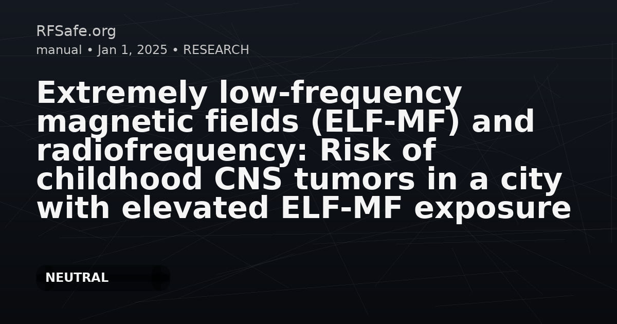Category: Epidemiology Tags: ELF-MF, radiofrequency, childhood cancer, CNS tumors, Mexico City, exposure assessment, tablet use DOI: 10.1016/j.envres.2025.122858 URL: sciencedirect.com Overview Central nervous system tumors (CNSTs) are the second most common childhood cancer. With unclear etiology, recent concerns have risen regarding the effects of extremely low-frequency magnetic fields (ELF-MF) and radiofrequency (RF) exposures. This study was conducted to examine the potential relationship between these exposures and CNST risk among Mexico City's pediatric population. Methods - Design: Case-control study (2017–2022) in Mexico City - Participants: 200 CNST patients, 793 controls (all under 16 years old) - Exposure Assessment: - Residential ELF-MF measured over a 24-hour period - RF exposure evaluated via duration of cell phone and electronic device usage - Reference Groups: ELF-MF exposure <0.1 μT, lowest RF quartile (Q1) - Data Analysis: R and SPSS software Findings - 5.1% of participants had ELF-MF exposure ≥0.3 μT. - Significant association: Elevated ELF-MF exposure (≥0.4 μT) doubled the risk of CNST (aOR=2.39; 95% CI: 1.15-5.00). - No association between cell phone use and CNST risk. - Prolonged tablet use linked to substantial CNST risk: - aOR=2.53 (95% CI: 1.39-4.61) with internet use - aOR=3.53 (95% CI: 1.45-8.59) without internet use Conclusion A significant portion of Mexico City children are exposed to ELF-MF levels ≥0.3 μT—higher than global averages. Elevated residential ELF-MF exposure and prolonged tablet use, both with and without internet connectivity, were significantly linked to increased childhood CNST risk. Highlights - Many Mexico City children exposed to ELF-MF ≥0.3 μT, surpassing global norms. - Elevated ELF-MF exposure correlates with increased childhood CNS tumor risk. - Prolonged tablet use also linked to higher CNST risk, especially in ages 6-10. - No CNST risk detected from cell phone use.
