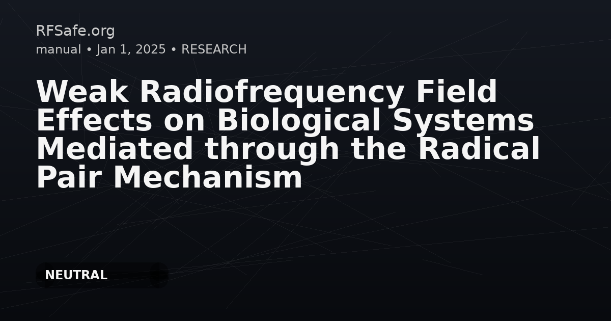 "main_findings": "This review synthesizes experimental and theoretical work on whether weak, nonthermal RF magnetic fields can produce biological effects via the radical pair mechanism (RPM). It notes difficulties reconciling RPM theoretical predictions with reported low-level experimental effects and highlights that many experimental reports have reproducibility, statistical robustness, and dosimetry accuracy issues. The authors conclude there is a tangible but not fully elucidated link between weak RF exposure and potential biological effects mediated by RPM, and call for more robust interdisciplinary studies and improved modeling.",