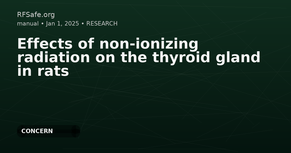 Category: Endocrinology, Toxicology Tags: Electromagnetic fields, Wi-Fi, mobile jammer, thyroid gland, rats, endocrine disruption, histopathology DOI: 10.1186/s13104-025-07297-x URL: bmcresnotes.biomedcentral.com Overview This study evaluated the effects of non-ionizing electromagnetic radiation on rat thyroid function and histopathology. Forty female and thirty male Sprague-Dawley rats (200-220 g, 2 months old) were exposed to 2.45 GHz Wi-Fi, mobile jammer radiation, or a sham condition. - Male rats (Group A) were exposed to Wi-Fi or mobile jammers for 2 hours daily over two weeks, with devices located within one meter of the cage (on or off). - The Sham group underwent the same setup but with devices off. - Group B included non-pregnant females, pregnant rats, and their offspring; all subgroups were either exposed or served as controls. - Researchers measured thyroid hormone levels in serum and performed microscopic histological analysis of thyroid follicle colloid and epithelium. Findings - T4 hormone levels were significantly altered in male rats exposed to mobile jammer radiation compared to controls (p = 0.037). - Among group B offspring, only male rats displayed significantly different T3 levels when exposed to jammer radiation (average = 109.00 in the experiment vs. 65.50 in controls, p < 0.001). - Histopathological analysis also revealed significant morphological differences and disruption in thyroid follicular structure in exposed rats. Conclusion These results highlight a strong potential link between exposure to electromagnetic radiation and changes in thyroid endocrine and histological parameters. - The findings suggest that persistent evaluation of safety guidelines for non-ionizing radiation exposure is warranted, especially regarding thyroid hormone balance and tissue structure. - There is clear evidence of electromagnetic fields contributing to altered thyroid function and cellular structure in exposed rats.