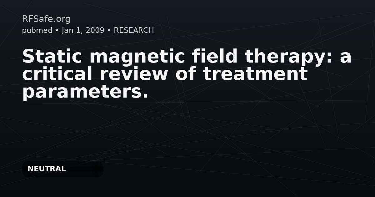 "main_findings": "This critical review of 56 English-language human studies found that key static magnetic field (SMF) treatment parameters were often incompletely reported. Site of application, magnet support device, and frequency/duration of application were most often described, while magnet dimensions, measured field strength, and estimated distance from target tissue were least often described. Thirty-four studies (61%) did not provide enough SMF dosage detail to allow replication.",
