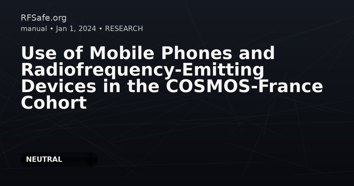 Use of Mobile Phones and Radiofrequency-Emitting Devices in the COSMOS-France Cohort Deltour I, Guida F, Ribet C, Zins M, Goldberg M, Schüz J. Use of Mobile Phones and Radiofrequency- Emitting Devices in the COSMOS-France Cohort. International Journal of Environmental Research and Public Health. 2024; 21(11):1514. doi: 10.3390/ijerph21111514. Abstract COSMOS-France is the French part of the COSMOS project, an international prospective cohort study that investigates whether the use of mobile phones and other wireless technologies is associated with health effects and symptoms (cancers, cardiovascular diseases, neurologic pathologies, tinnitus, headaches, or sleep and mood disturbances). Here, we provide the first descriptive results of COSMOS- France, a cohort nested in the general population-based cohort of adults named Constances. Methods: A total of 39,284 Constances volunteers were invited to participate in the COSMOS-France study during the pilot (2017) and main recruitment phase (2019). Participants were asked to complete detailed questionnaires on their mobile phone use, health conditions, and personal characteristics. We examined the association between mobile phone use, including usage for calls and Voice over Internet Protocol (VoIP), cordless phone use, and Wi-Fi usage with age, sex, education, smoking status, body mass index (BMI), and handedness. Results: The participation rate was 48.4%, resulting in 18,502 questionnaires in the analyzed dataset. Mobile phone use was reported by 96.1% (N = 17,782). Users reported typically calling 5–29 min per week (37.1%, N = 6600), making one to four calls per day (52.9%, N = 9408), using one phone (83.9%, N = 14,921) and not sharing it (80.4% N = 14,295), mostly using the phone on the side of the head of their dominant hand (59.1%, N = 10,300), not using loudspeakers or hands-free kits, and not using VoIP (84.9% N = 15,088). Individuals’ age and sex modified this picture, sometimes markedly. Education and smoking status were associated with ever use and call duration, but neither BMI nor handedness was. Cordless phone use was reported by 66.0% of the population, and Wi-Fi use was reported by 88.4%. Conclusion: In this cross-sectional presentation of contemporary mobile phone usage in France, age and sex were important determinants of use patterns. Open access paper: mdpi.com