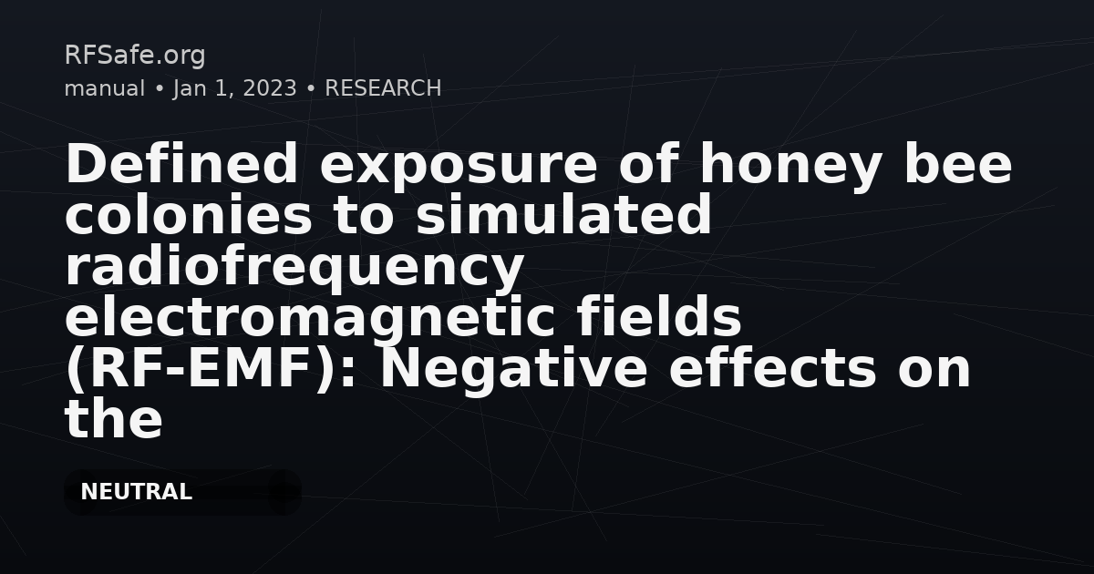 Exposure of honey bee colonies to simulated RF-EMF: Negative effects on homing ability Treder M, Müller M, Fellner L, Traynor K, Rosenkranz P. Defined exposure of honey bee colonies to simulated radiofrequency electromagnetic fields (RF-EMF): Negative effects on the homing ability, but not on brood development or longevity. Sci Total Environ. 2023 Jun 28:165211. doi: 10.1016/j.scitotenv.2023.165211. Highlights • RF-EMF exposure significantly reduced homing success of honey bees. • These effects on homing behavior were only evident after long-term, not short-term, irradiation • Honey bee brood development and longevity was not affected by RF-EMF. Abstract Urbanization and the increasing use of wireless technologies lead to higher emission rates of radiofrequency electromagnetic fields (RF-EMF) in populated areas. This anthropogenic electromagnetic radiation is a form of environmental pollution and a potential stressor on bees or other flying insects. Cities often have a high density of wireless devices operating on microwave frequencies, which generate electromagnetic frequencies e.g. in the 2.4 and 5.8 GHz bands commonly used by the wireless technologies. To date the effects of nonionizing electromagnetic radiation on the vitality and behavior of insects are poorly understood. In our experiment we used honey bees as model organisms and analyzed the effects of defined exposures to 2.4 and 5.8 GHz on brood development, longevity and homing ability under field conditions. To generate this radiation, we used a high- quality radiation source which generates a consistent, definable and realistic electromagnetic radiation, engineered for this experiment by the Communications Engineering Lab (CEL) at the Karlsruhe Institute of Technology. Our results show significant effects of long-term exposures on the homing ability of foraging honey bees, but no effects on brood development and adult worker longevity. Using this novel and high-quality technical set-up, this interdisciplinary work provides new data on the effects of these widely used frequencies on important fitness parameters of free-flying honey bees. pubmed.ncbi.nlm.nih.gov Excerpts "We investigated the impacts on homing ability by transporting bees 500 meters away from their colonies, then comparing the number of successful return flights of treated and control bees. Long-term RF-EMF exposure had a clear negative impact on the orientation ability of foraging honey bees (GLMM, p = 0.0064). The number of bees that successfully found their way back to their hives differed significantly, with 95.2 % of the bees in the control group returning home successfully compared to only 78.6 % of the bees in the treatment group. The long-term treated bees also required approximately 20 % more time on their return homing flights compared to the controls (median: EMF 9:58 min vs. Control 8:14 min), however these differences were not significant (GLMM, p = 0.4508)." "Conclusion The complex effects of radiofrequency electromagnetic fields (RF-EMF) on insects needs increased attention. Our results suggest that there are no lethal or highly obvious impacts on honey bee health, however RF-EMF acts as a sublethal stressor, reducing the homing success of honey bees and thus generating a loss of foragers. This disorientation only occurs in colonies continuously exposed to the tested and field realistic RF-EMF, a signal commonly used for Wi-Fi. RF-EMF did not impact other important fitness parameters, such as the overall development of healthy brood or longevity. Due to their different nesting habitats and degrees of sociality, wild bees may be more susceptible to negative effects of electromagnetic radiation. These knowledge gaps must be urgently addressed, as many wild bee species are threatened by extinction. In our globalized and interconnected world, few environments are free of electromagnetic radiation. A better understanding of the sublethal effects of electromagnetic radiation exposure on communication, learning, memory, and development of bees and insects are urgently needed."