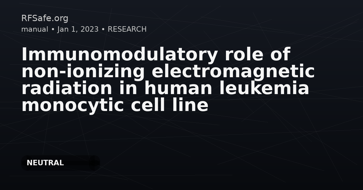 Immunomodulatory role of non-ionizing electromagnetic radiation in human leukemia monocytic cell line Yadav H, Singh R. Immunomodulatory role of non-ionizing electromagnetic radiation in human leukemia monocytic cell line. Environ Pollut. 2023 May 17;331(Pt 2):121843. doi: 10.1016/j.envpol.2023.121843. Abstract In daily life, people are usually exposed to radiofrequency radiations (RFR). The effects of RFR on human physiology have been a major source of controversy since the WHO declared that these radiations are a type of environmental energy that interacts with the physiological functioning of the human body. The immune system provides internal protection and promotes long-term health and survival. However, the relevant research on the innate immune system and radiofrequency radiation is scant. In this connection, we hypothesized that innate immune responses would be influenced by exposure to non-ionizing electromagnetic radiation from mobile phones in a cell-specific and time-dependent manner. To test this hypothesis, human leukemia monocytic cell lines were exposed to 2318 MHz (MHz) RFR emitted by mobile phones at a power density of 0.224 W/m2 in a controlled manner for various time durations (15, 30, 45, 60, 90, and 120 min). Systematic studies on cell viability, nitric oxide (NO), superoxide (SO), pro-inflammatory cytokine production, and phagocytic assays were performed after the irradiation. The duration of exposure seems to have a substantial influence on the RFR- induced effects. It was noticed that after 30 min of exposure, the RFR dramatically enhanced the pro- inflammatory cytokine IL-1α level as well as reactive species such as NO and SO generation as compared to the control. In contrast, the RFR dramatically reduced the phagocytic activity of monocytes during 60 min of treatment when compared to the control. Interestingly, the irradiated cells restored their normal functioning until the final 120-min of exposure. Furthermore, mobile phone exposure had no influence on cell viability or TNF-α level. The results showed that RFR exhibits a time-dependent immune-modulatory role in the human leukemia monocytic cell line. Nevertheless, more research is needed to further determine the long-term effects and precise mechanism of action of RFR. pubmed.ncbi.nlm.nih.gov