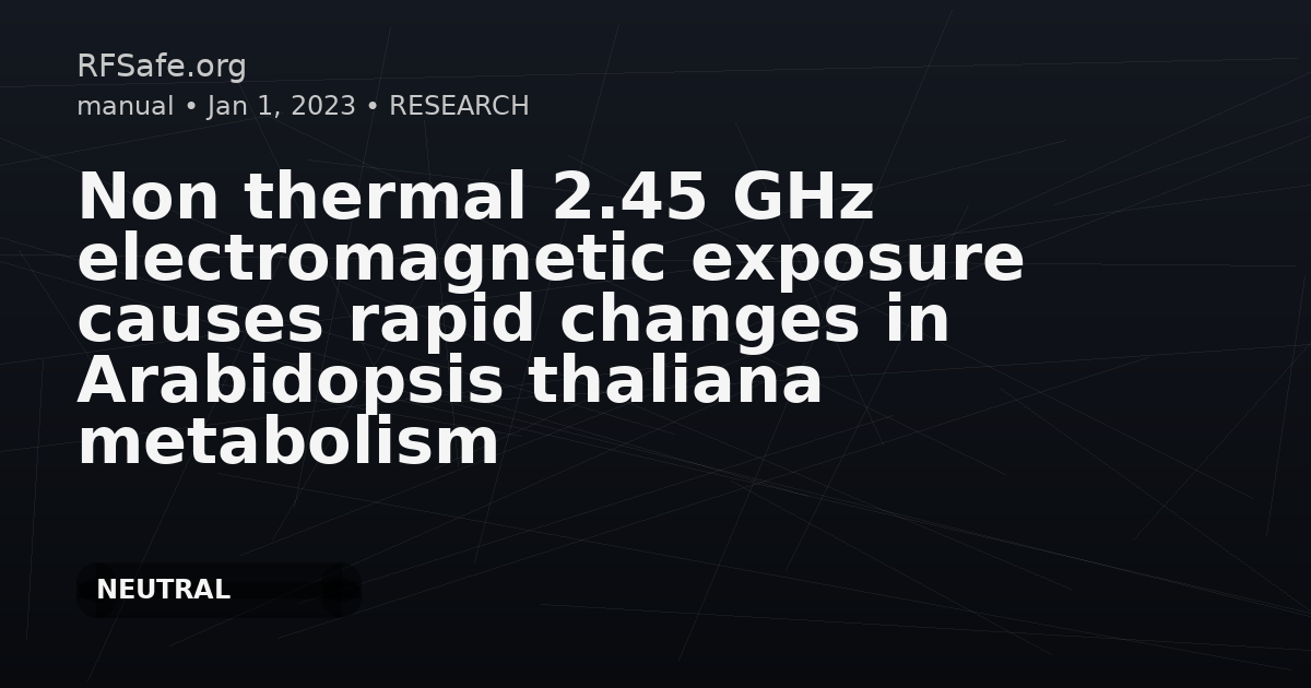 Non thermal 2.45 GHz electromagnetic exposure causes rapid changes in Arabidopsis thaliana metabolism Porcher A, Girard S, Bonnet P, Rouveure R, Guérin V, Paladian F, Vian A. Non thermal 2.45 GHz electromagnetic exposure causes rapid changes in Arabidopsis thaliana metabolism. J Plant Physiol. 2023 May 11;286:153999. doi: 10.1016/j.jplph.2023.153999. Highlights • In our condition, 2.45 GHz HF-EMF exposure did not induce thermal effect in plants. • We observed rapid and transcient changes of gene expression and H2O2 metabolism. • Non-thermal biological responses to EMF exposure do exist in plants. Abstract Numerous studies report different types of responses following exposure of plants to high frequency electromagnetic fields (HF-EMF). While this phenomenon is related to tissue heating in animals, the situation is much less straightforward in plants where metabolic changes seem to occur without tissue temperature increase. We have set up an exposure system allowing reliable measurements of tissue heating (using a reflectometric probe and thermal imaging) after a long exposure (30 min) to an electromagnetic field of 2.45 GHz transmitted through a horn antenna (about 100 V m-1 at the plant level). We did not observe any heating of the tissues, but we detected rapid increases (60 min) in the accumulation of transcripts of stress-related genes (TCH1 and ZAT12 transcription factor) or involved in ROS metabolism (RBOHF and APX1). At the same time, the amounts of hydrogen peroxide and dehydroascorbic acid increased while glutathione (reduced and oxidized forms), ascorbic acid, and lipid peroxidation remained stable. Therefore, our results unambiguously show that molecular and biochemical responses occur rapidly (within 60min) in plants after exposure to an electromagnetic field, in absence of tissue heating. pubmed.ncbi.nlm.nih.gov