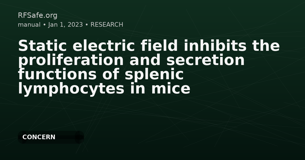 Static electric field inhibits the proliferation and secretion functions of splenic lymphocytes in mice Dong L, Wu J, Di G. Static electric field inhibits the proliferation and secretion functions of splenic lymphocytes in mice. Int J Environ Health Res. 2023 Apr 18:1-11. doi: 10.1080/09603123.2023.2202900. Abstract In recent years, the effects of static electric field (SEF) generated by ultra-high voltage (UHV) direct current (DC) transmission lines on health has drawn public attention. To study the effects of SEF on the spleen, mice were exposed to 56.3 ± 1.4 kV/m SEF. Results showed that on the 28th day of SEF exposure, the contents of IL-10 and IFN-γ in the supernatant of homogenate, the proliferation levels of lymphocytes and the content of intracellular ROS decreased significantly, while the activity of SOD increased significantly. Meanwhile, the rupture of cellular membrane, the deficiency of mitochondrial cristae and the vacuolization of mitochondria appeared in lymphocytes. Analysis showed that the rupture of the cellular membrane caused the death of T lymphocytes, which would lead to the reduction of IL-10 and IFN-γ secretions. The damage of mitochondria could reduce the production of ATP and the content of ROS, which could inhibit the proliferation of splenic lymphocytes. pubmed.ncbi.nlm.nih.gov