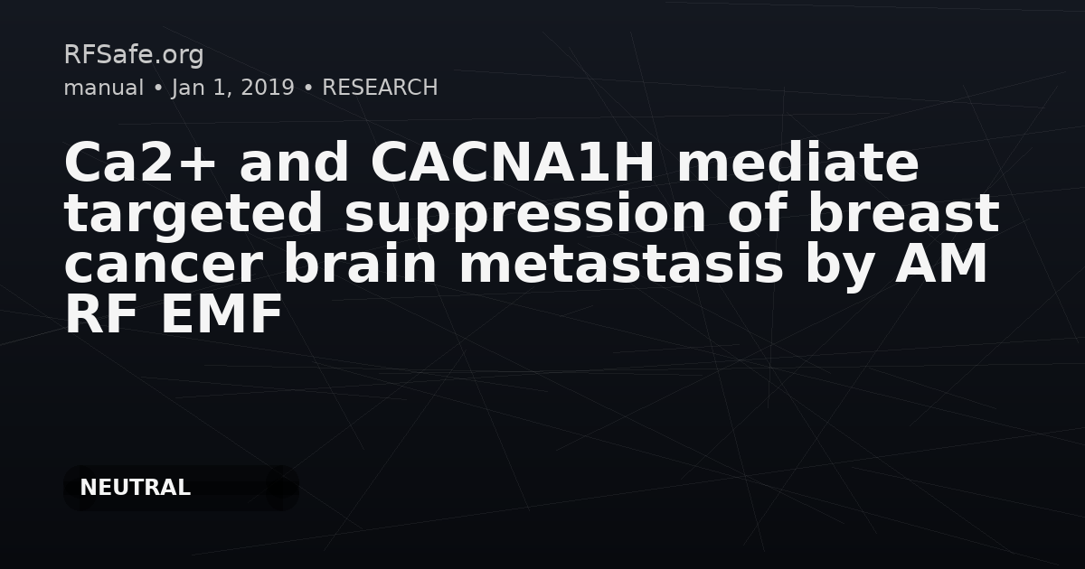 "main_findings": "27.12 MHz athermal amplitude-modulated RF EMF at breast cancer specific frequencies was associated with decreased growth/metastases in brain-tropic cell line animal models and strong suppression of growth in brain metastasis PDX models. The authors report significant and durable regression of a brain metastasis in one patient, and propose mediation via Ca2+ influx through CACNA1H with downstream signaling changes and reduced angiogenesis-related markers.",