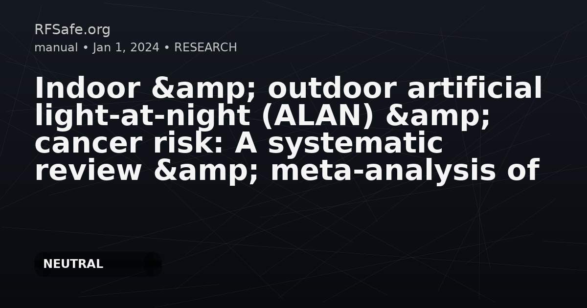 "linkedin": "A 2024 systematic review and random-effects meta-analysis (Science of The Total Environment) synthesized 28 observational studies (2.5M participants) on indoor/outdoor artificial light-at-night (ALAN) and cancer incidence. Outdoor ALAN was associated with breast cancer risk (RR 1.12), while indoor ALAN and prostate cancer results were non-significant; exposure assessment quality (e.g., low-resolution satellite data, no light color information) was highlighted as a key limitation."