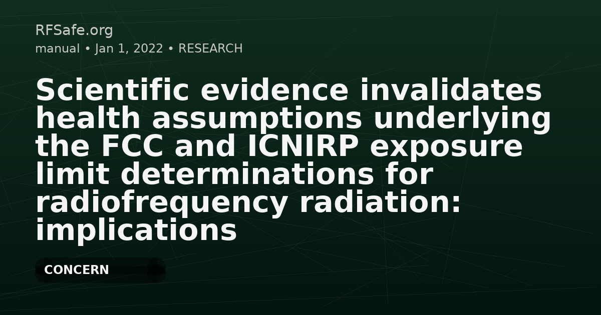 Scientific evidence invalidates health assumptions underlying the FCC and ICNIRP exposure limit determinations for radiofrequency radiation: implications for 5G International Commission on the Biological Effects of Electromagnetic Fields. Scientific evidence invalidates health assumptions underlying the FCC and ICNIRP exposure limit determinations for radiofrequency radiation: implications for 5G. Environmental Health. (2022) 21:92. doi.org:10.1186/s12940-022-00900-9. Abstract In the late-1990s, the FCC and ICNIRP adopted radiofrequency radiation (RFR) exposure limits to protect the public and workers from adverse effects of RFR. These limits were based on results from behavioral studies conducted in the 1980s involving 40–60-minute exposures in 5 monkeys and 8 rats, and then applying arbitrary safety factors to an apparent threshold specific absorption rate (SAR) of 4 W/kg. The limits were also based on two major assumptions: any biological effects were due to excessive tissue heating and no effects would occur below the putative threshold SAR, as well as twelve assumptions that were not specified by either the FCC or ICNIRP. In this paper, we show how the past 25 years of extensive research on RFR demonstrates that the assumptions underlying the FCC’s and ICNIRP’s exposure limits are invalid and continue to present a public health harm. Adverse effects observed at exposures below the assumed threshold SAR include non-thermal induction of reactive oxygen species, DNA damage, cardiomyopathy, carcinogenicity, sperm damage, and neurological effects, including electromagnetic hypersensitivity. Also, multiple human studies have found statistically significant associations between RFR exposure and increased brain and thyroid cancer risk. Yet, in 2020, and in light of the body of evidence reviewed in this article, the FCC and ICNIRP reaffirmed the same limits that were established in the 1990s. Consequently, these exposure limits, which are based on false suppositions, do not adequately protect workers, children, hypersensitive individuals, and the general population from short- term or long-term RFR exposures. Thus, urgently needed are health protective exposure limits for humans and the environment. These limits must be based on scientific evidence rather than on erroneous assumptions, especially given the increasing worldwide exposures of people and the environment to RFR, including novel forms of radiation from 5G telecommunications for which there are no adequate health effects studies. Key points • ICBE-EMF scientists report that exposure limits for radiofrequency (or wireless) radiation set by ICNIRP and the FCC are based on invalid assumptions and outdated science, and are not protective of human health and wildlife. • ICBE-EMF calls for an independent assessment of the effects and risks of radiofrequency radiation based on scientific evidence from peer-reviewed studies conducted over the past 25 years. The aim of such assessment would be to establish health protective exposure standards for workers, the public, and the environment. • The public should be informed of the health risks of wireless radiation and encouraged to take precautions to minimize exposures, especially for children, pregnant women and people who are electromagnetically hypersensitive. • ICBE-EMF calls for an immediate moratorium on further rollout of 5G wireless technologies until safety is demonstrated and not simply assumed. Open access paper: ehjournal.biomedcentral.com