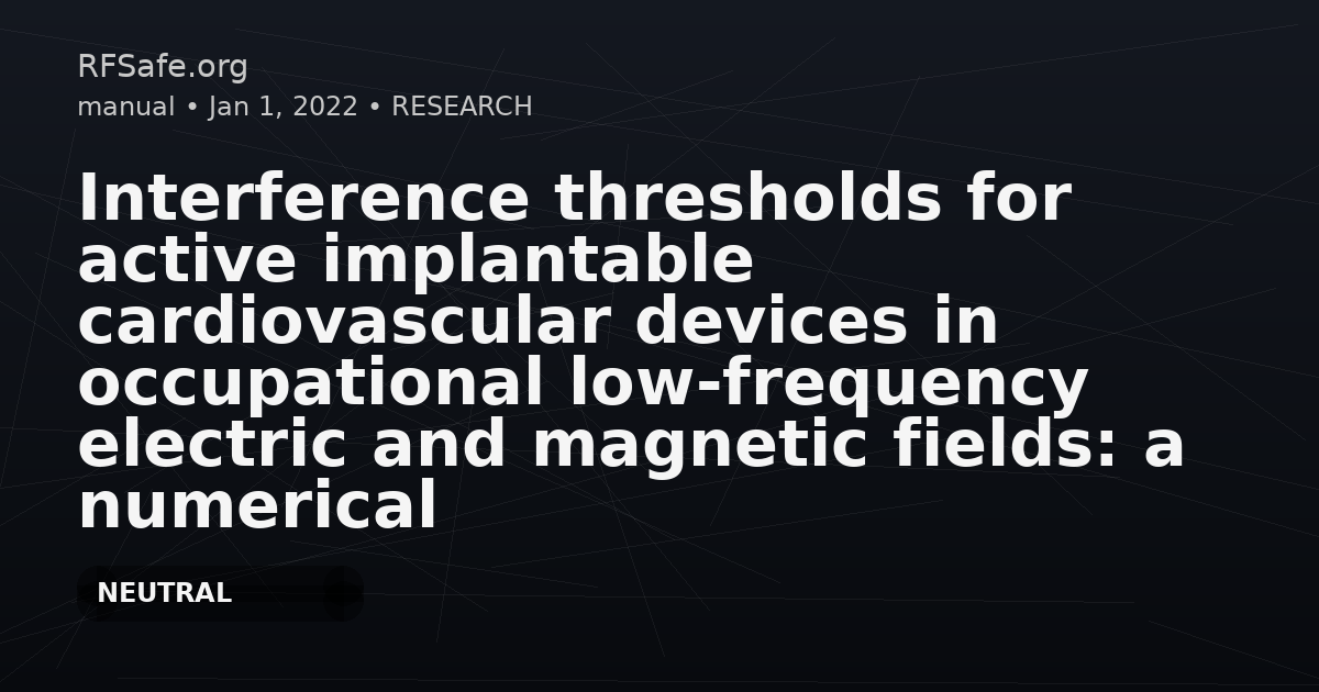 Interference thresholds for active implantable cardiovascular devices in occupational low-frequency electric and magnetic fields: a numerical and in vitro study Zhou M, Kourtiche D, Claudel J, Deschamps F, Magne I, Roth P, Schmitt P, Souques M, Nadi M. Interference thresholds for active implantable cardiovascular devices in occupational low-frequency electric and magnetic fields: a numerical and in vitro study. Med Eng Phys. 2022 Jun;104:103799. doi: 10.1016/j.medengphy.2022.103799. Abstract In light of concerns regarding the occupational safety and health of workers wearing active implantable medical devices (AIMDs), this study aims to investigate the potential risks of electromagnetic interference (EMI) between AIMDs and low-frequency 50/60 Hz electromagnetic fields (EMFs) in the workplace. A total of 58 AIMDs, consisting of pacemakers (PMs) and implantable cardiac defibrillators (ICDs) of different brands, models, and configurations were tested to determine the immunity thresholds for high-voltage electric fields (EFs) and magnetic fields (MFs) at 50/60 Hz. The EFs and MFs at the levels in workplaces are reproduced by setups using Helmholtz coils and aluminum plates, respectively, to ensure that the EM/MF exposures are controllable and reproducible. The EMI thresholds were recorded by observing the occurrences of PM or ICD dysfunctions. In addition, numerical studies on anatomical models were carried out using CST® software. The results indicate that the recorded thresholds all exceed the EF and MF public exposure limits given in the ICNIRP 2010 guidelines. No dysfunction was observed among four ICDs tested under MF exposure up to 2750 µT at 50 Hz and 2480 µT at 60 Hz. However, among the 43 PMs and 11 ICDs tested under EF exposures, potential hazards may occur below the occupational exposure level proposed in the ICNIRP guidelines. pubmed.ncbi.nlm.nih.gov