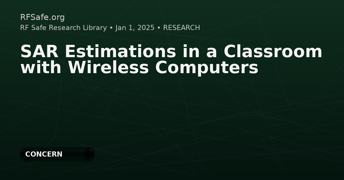 This study simulated 1 g and 10 g peak spatial SAR (psSAR) in classroom settings where each student uses a Wi‑Fi laptop at 2.45 GHz and 100 mW. Maximum simulated psSAR values were reported to be below ICNIRP and IEEE recommended limits, but desk spacing and multi-user configurations could substantially increase psSAR compared with a single-user setup. The authors emphasize that long-term low-level exposure, particularly for children, remains a concern and recommend mitigation via increased spacing and wired connections.