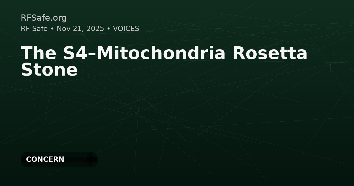 This RF Safe article argues that a common biological mechanism links RF/ELF exposure to downstream outcomes such as cancer, infertility, and autoimmune dysfunction. It proposes a causal chain in which RF/ELF fields disrupt S4 voltage-sensor timing in voltage-gated ion channels, altering calcium signaling and triggering mitochondrial reactive oxygen species (ROS) that lead to tissue-specific damage. The piece cites mechanistic researchers and references major animal studies and WHO-commissioned systematic reviews, but presents the argument as a unifying narrative rather than a new peer-reviewed study.
