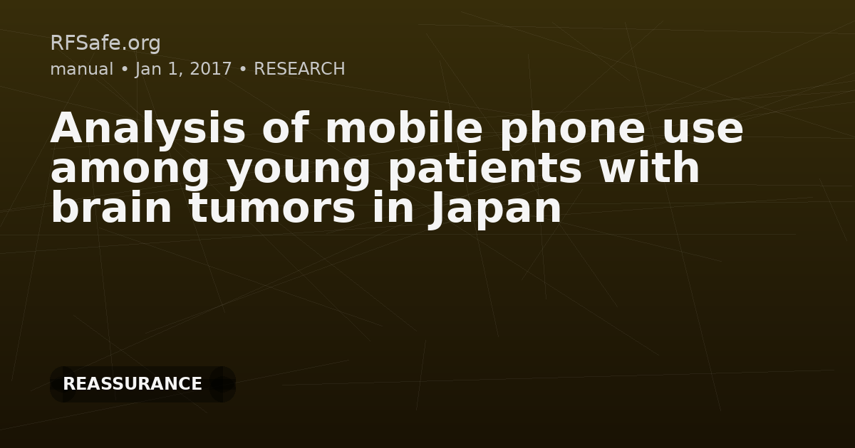 "linkedin": "Bioelectromagnetics (2017): Analysis of mobile phone ownership among 82 Japanese brain tumor patients aged 6–18 found standardized ownership ratios vs general-population surveys that did not indicate a difference; limitations include small sample size and limited exposure characterization."