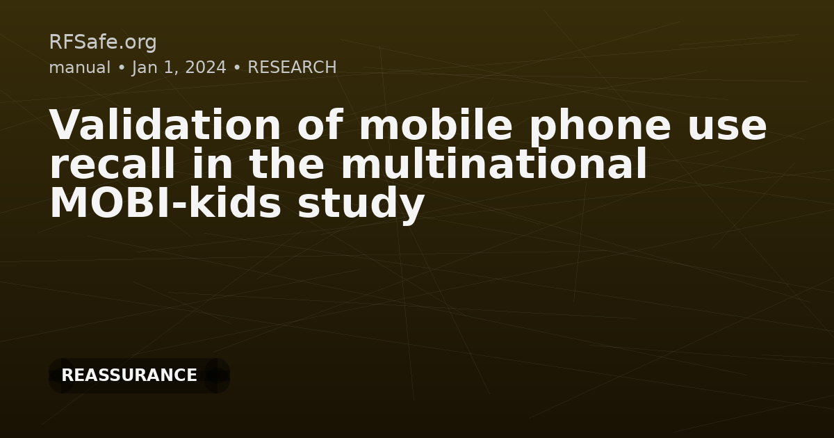 Validation of mobile phone use recall in the multinational MOBI-kids study van Wel L, Huss A, Kromhout H, Momoli F, Krewski D, Langer CE, Castaño-Vinyals G, Kundi M, Maule M, Miligi L, Sadetzki S, Albert A, Alguacil J, Aragones N, Badia F, Bruchim R, Goedhart G, de Llobet P, Kiyohara K, Kojimahara N, Lacour B, Morales-Suarez-Varela M, Radon K, Remen T, Weinmann T, Vrijheid M, Cardis E, Vermeulen R; MOBI-Kids consortium. Validation of mobile phone use recall in the multinational MOBI-kids study. Bioelectromagnetics. 2024 May 22. doi: 10.1002/bem.22507. Abstract Potential differential and non-differential recall error in mobile phone use (MPU) in the multinational MOBI-Kids case-control study were evaluated. We compared self-reported MPU with network operator billing record data up to 3 months, 1 year, and 2 years before the interview date from 702 subjects aged between 10 and 24 years in eight countries. Spearman rank correlations, Kappa coefficients and geometric mean ratios (GMRs) were used. No material differences in MPU recall estimates between cases and controls were observed. The Spearman rank correlation coefficients between self-reported and recorded MPU in the most recent 3 months were 0.57 and 0.59 for call number and for call duration, respectively. The number of calls was on average underestimated by the participants (GMR = 0.69), while the duration of calls was overestimated (GMR = 1.59). Country, years since start of using a mobile phone, age at time of interview, and sex did not appear to influence recall accuracy for either call number or call duration. A trend in recall error was seen with level of self-reported MPU, with underestimation of use at lower levels and overestimation of use at higher levels for both number and duration of calls. Although both systematic and random errors in self-reported MPU among participants were observed, there was no evidence of differential recall error between cases and controls. Nonetheless, these sources of exposure measurement error warrant consideration in interpretation of the MOBI-Kids case-control study results on the association between children's use of mobile phones and potential brain cancer risk. Highlights • Self-reported and operator-registered phone calls were compared among MobiKids participants. • On average, number of calls was underestimated, and duration overestimated. • No differential recall error was found between brain tumor cases and controls in MobiKids. Excerpts The comparison of self-reported and recorded MPU was conducted separately for the number and duration (in minutes) of calls in the 3 months preceding the date of interview. In addition, a subset of subjects who had data available for 1 year, and a subset for 2 years preceding the date of interview were assessed.... A total of 702 subjects from eight different countries (Canada, France, Germany, Greece, Israel, Italy, Korea, and Spain) had data on both self-reported and recorded MPU in the 3 months preceding the interview date (Table 1).... The overall GMRs of self-reported versus recorded MPU in the most recent 3 months were 1.59 for call duration and 0.69 for call number, indicating systematic errors in the form of overreporting of call duration of calls and underreporting of the number of calls. Looking at recall over time for subjects with 2 years of data available, there appears to be a lower level of overreporting of duration of calls for both cases (initial GMR 1.62, 1.44 at 1 year) and controls (initial GMR 1.37, 1.08 at 1 year) between recent and 1 year recall. There is however little difference in recall in call duration over time between the 1 and 2 year time points for either cases or controls (1.44 vs. 1.41 and 1.08 vs. 1.07, respectively) (Table 5). Although this same initial decrease can be seen in controls for recall of number of calls, it is less clear for cases (Table 4).... While not all subjects from the main MOBI-Kids study provided informed consent to obtain their network operator data and not all operators provided data, we managed to include a large proportion of subjects (24.8%) from the MOBI-Kids case–control study in this validation study. The proportion of subjects where longer-term data was available (at 1- and 2-year time periods) was smaller, with no subjects from some of the participating countries.... ... it may not always be clear from billing records who the actual user of the phone was when making calls. Therefore, while billing records provide insight into validity and possible calibration of self-reports, they may not represent the gold standard for studies, especially due to the low number of retained study participants, and also because internet-based calling (VoiP) is not included in the records.... Both the COSMOS (Reedijk et al., 2024) as well as the INTERPHONE validation (Vrijheid et al., 2009) studies found significantly differing ratios between countries. In the present study we did see some differences in GMRs among the eight participating countries, but the differences did not achieve statistical significance. In contrast, the MOBI-Expo validation study by Goedhart et al. (2018) did find significant differences among countries with participants from Greece, Israel, and Korea underestimating the duration of calls while in other countries duration was overestimated.... CONCLUSIONS We compared self-reported MPU with operator data at 3 months, 1 year, and 2 years preceding the interview date. No indication of differential recall error between cases and controls was found. Both non-differential systematic and random errors were observed, with number of calls being underreported and duration of calls being over-reported on average in both cases and controls. If there are true underlying risks, then the observed non-differential random errors may bias risk estimates towards their null values and decrease study power. Open access paper: onlinelibrary.wiley.com