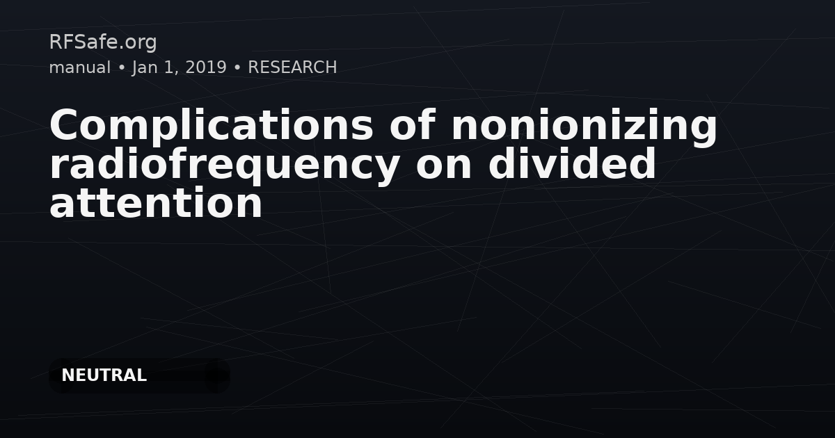 Complications of nonionizing radiofrequency on divided attention Bamdad K, Adel Z, Esmaeili M. Complications of nonionizing radiofrequency on divided attention. J Cell Biochem. 2019 Feb 3. doi: 10.1002/jcb.28343. Abstract Exposure to electromagnetic fields is considered as a potential hazard for biological systems. The objective of our investigation is the study of probable consequences of radiofrequency electromagnetic fields from Wi-Fi router devices on the short-term memory, and attention's levels. A population consisting of 312 female college students (14 to 17 years old) was elected by cluster random sampling. Teenagers were divided into two groups of control group (Wi-Fi nonusers; n = 138), and experiment group (Wi-Fi users; n = 174). Both groups have been examined using short-term memory tests; selective attention, and also divided attention tests. According to the results, there was no significant difference between using Wi-Fi router devices on levels of selective attentions and short-term memory of the sample students with the control group. However, analyses revealed that there is a significant correlation between the use of Wi-Fi routers and declining levels of divided attentions. Our investigation has demonstrated the adverse consequences of 2.4-2.48 GHz radiofrequency electromagnetic fields of Wi-Fi router devices on divided attention levels of female university students that should be mentioned as a technological risk factor and taken into account by healthcare organizations. ncbi.nlm.nih.gov Note: This was an observational study, not a randomized trial. The observed difference on divided attention may be due to confounding.
