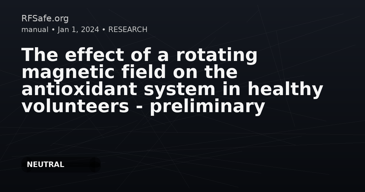 "tweet": "Preliminary Sci Rep (2024): serum samples from 30 healthy volunteers exposed to a rotating magnetic field (25/50 Hz; 1–3 h) showed significant changes in oxidative stress markers (e.g., SOD, MDA, TAC, ROMO1), with mixed patterns across conditions.",