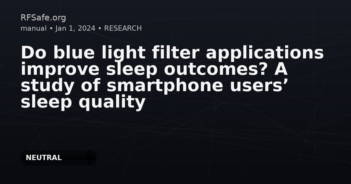 Do blue light filter applications improve sleep outcomes? A study of smartphone users’ sleep quality in an observational setting Rabiei M, Masoumi SJ, Haghani M, Nematolahi S, Rabiei R, Mortazavi SMJ (2024). Do blue light filter applications improve sleep outcomes? A study of smartphone users’ sleep quality in an observational setting. Electromagnetic Biology and Medicine, DOI: 10.1080/15368378.2024.2327432. Abstract Exposure to blue light at bedtime, suppresses melatonin secretion, postponing the sleep onset and interrupting the sleep process. Some smartphone manufacturers have introduced night-mode functions, which have been claimed to aid in improving sleep quality. In this study, we evaluate the impact of blue light filter application on decreasing blue light emissions and improving sleep quality. Participants in this study recorded the pattern of using their mobile phones through a questionnaire. In order to evaluate sleep quality, we used a PSQI questionnaire. Blue light filters were used by 9.7% of respondents, 9.7% occasionally, and 80% never. The mean score of PSQI was more than 5 in 54.10% of the participants and less than 5 in 45.90%. ANOVA test was performed to assess the relationship between using blue light filter applications and sleep quality (p-value = 0.925). The findings of this study indicate a connection between the use of blue light filter apps and habitual sleep efficiency in the 31–40 age group. However, our results align only to some extent with prior research, as we did not observe sustained positive effects on all parameters of sleep quality from the long-term use of blue light filtering apps. Several studies have found that blue light exposure can suppress melatonin secretion, exacerbating sleep problems. Some studies have reported that physical blue light filters, such as lenses, can affect melatonin secretion and improve sleep quality. However, the impact of blue light filtering applications remains unclear and debatable. Plain Language Summary Using smartphones before bedtime and being exposed to its blue light can make it harder to fall asleep and disrupt your sleep. Some smartphone makers have introduced a night mode feature claiming it can help improve your sleep. In this study, we wanted to find out if using these blue light filters on smartphones really makes a difference. We asked people how often they used blue light filters on their phones and also had them fill out a questionnaire about their sleep quality. Only about 10% of people said they used blue light filters regularly, another 10% used them occasionally, and the majority, around 80%, never used them. When we looked at the results, more than half of the participants had sleep scores higher than 5, indicating they might have sleep problems. Less than half had sleep scores lower than 5, suggesting better sleep quality. We used some statistical tests to see if using blue light filters had any link to sleep quality, and the results showed that there was only a connection between the use of blue light filter apps and habitual sleep efficiency in the 31–40 age group. Our findings matched what other studies have found before, that using blue light filters on smartphones may not significantly help improve sleep. So, while it might be a good idea to limit smartphone use before bed, using a blue light filter app may not be the magic solution for better sleep. tandfonline.com