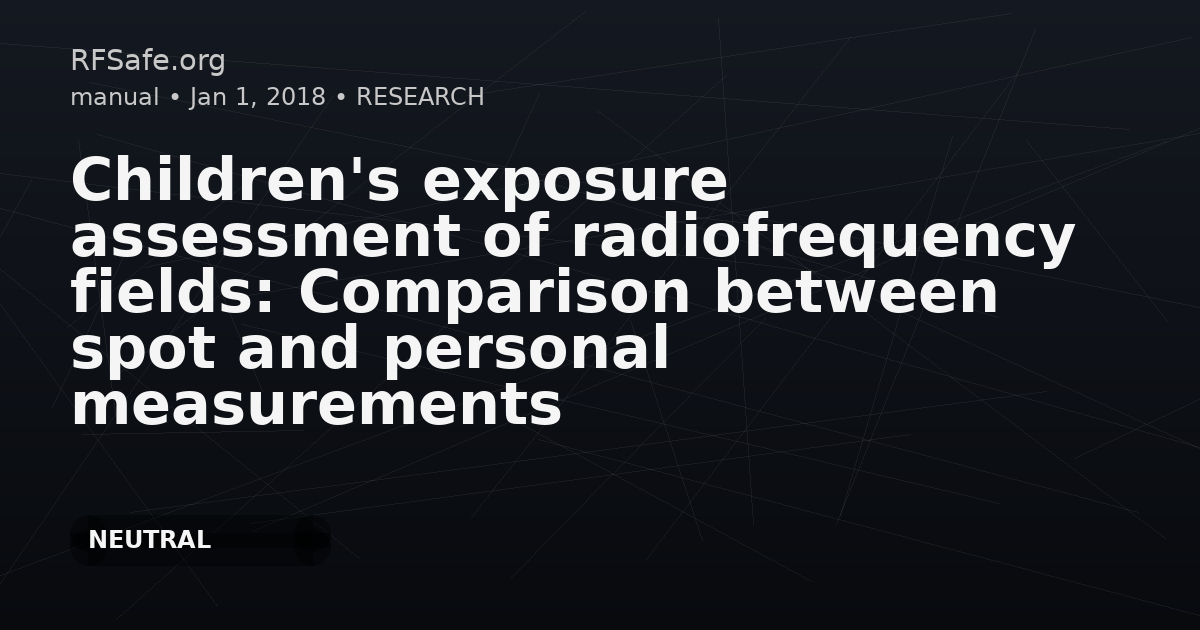 Children's exposure assessment of radiofrequency fields: Comparison between spot and personal measurements Gallastegi M, Huss A, Santa-Marina L, Aurrekoetxea JJ, Guxens M, Birks LE, Ibarluzea J, Guerra D, Röösli M. Children's exposure assessment of radiofrequency fields: Comparison between spot and personal measurements. Environment International. 118:60-69. Sep 2018. Highlights • Children's radiofrequency field levels and contribution of sources were assessed. • We contrasted exposure assessment based on spot and personal measurements. • Median exposures range: 29.73-236.31 μW/m2; broadcast and downlink contributed most. • Proportional bias between assessment based on spot and personal measurements. • No systematic differences when classifying subjects in exposure-dependent groups. Abstract Introduction Radiofrequency (RF) fields are widely used and, while it is still unknown whether children are more vulnerable to this type of exposure, it is essential to explore their level of exposure in order to conduct adequate epidemiological studies. Personal measurements provide individualized information, but they are costly in terms of time and resources, especially in large epidemiological studies. Other approaches, such as estimation of time- weighted averages (TWAs) based on spot measurements could simplify the work. Objectives The aims of this study were to assess RF exposure in the Spanish INMA birth cohort by spot measurements and by personal measurements in the settings where children tend to spend most of their time, i.e., homes, schools and parks; to identify the settings and sources that contribute most to that exposure; and to explore if exposure assessment based on spot measurements is a valid proxy for personal exposure. Methods When children were 8 years old, spot measurements were conducted in the principal settings of 104 participants: homes (104), schools and their playgrounds (26) and parks (79). At the same time, personal measurements were taken for a subsample of 50 children during 3 days. Exposure assessment based on personal and on spot measurements were compared both in terms of mean exposures and in exposure- dependent categories by means of Bland-Altman plots, Cohen's kappa and McNemar test. Results Median exposure levels ranged from 29.73 (in children's bedrooms) to 200.10 μW/m2 (in school playgrounds) for spot measurements and were higher outdoors than indoors. Median personal exposure was 52.13 μW/m2 and median levels of assessments based on spot measurements ranged from 25.46 to 123.21 μW/m2. Based on spot measurements, the sources that contributed most to the exposure were FM radio, mobile phone downlink and Digital Video Broadcasting-Terrestrial, while indoor and personal sources contributed very little (altogether <20%). Similar distribution was observed with personal measurements. There was a bias proportional to power density between personal measurements and estimates based on spot measurements, with the latter providing higher exposure estimates. Nevertheless, there were no systematic differences between those methodologies when classifying subjects into exposure categories. Personal measurements of total RF exposure showed low to moderate agreement with home and bedroom spot measurements and agreed better, though moderately, with TWA based on spot measurements in the main settings where children spend time (homes, schools and parks; Kappa = 0.46). Conclusions Exposure assessment based on spot measurements could be a feasible proxy to rank personal RF exposure in children population, providing that all relevant locations are being measured. sciencedirect.com