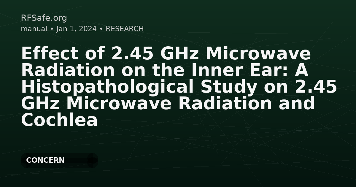Effect of 2.45 GHz Microwave Radiation on the Inner Ear: A Histopathological Study on 2.45 GHz Microwave Radiation and Cochlea Tahir E, Akar Karadayı A, Gülşen Gürgen S, Korunur Engiz B, Turgut A. Effect of 2.45 GHz Microwave Radiation on the Inner Ear: A Histopathological Study on 2.45 GHz Microwave Radiation and Cochlea. J Int Adv Otol. 2024 Jan;20(1):35-43. doi: 10.5152/iao.2024.231142. Abstract Background: The present study aims to determine the possible low dose-dependent adverse effects of 2.45 GHz microwave exposure and Wi-Fi frequency on the cochlea. Methods: Twelve pregnant female rats (n=12) and their male newborns were exposed to Wi-Fi frequencies with varying electric field values of 0.6, 1.9, 5, 10 V/m, and 15 V/m during the 21-day gestation period and 45 days after birth, except for the control group. Auditory brainstem response testing was performed before exposure and sacrification. After removal of the cochlea, histopathological examination was conducted by immunohistochemistry methods using caspase (cysteine-aspartic proteases, cysteine aspartates, or cysteine-dependent aspartate-directed proteases)-3, -9, and terminal deoxynucleotidyl transferase dUTP nick end labeling (TUNEL). Kruskal-Wallis and Wilcoxon tests and multivariate analysis of variance were used. Results: Auditory brainstem response thresholds in postexposure tests increased statistically significantly at 5 V/m and above doses. When the number of apoptotic cells was compared in immunohistochemistry examination, significant differences were found at 10 V/m and 15 V/m doses (F(5,15)=23.203, P=.001; Pillai's trace=1.912, η2=0.637). As the magnitude of the electric field increased, all histopathological indicators of apoptosis increased. The most significant effect was noted on caspase- 9 staining (η2 c9=0.996), followed by caspase-3 (η2 c3=0.991), and TUNEL staining (η2 t=0.801). Caspase-3, caspase-9, and TUNEL-stained cell densities increased directly by increasing the electric field and power values. Conclusion: Apoptosis and immune activity in the cochlea depend on the electric field and power value. Even at low doses, the electromagnetic field in Wi-Fi frequency damages the inner ear and causes apoptosis. Open access paper: ncbi.nlm.nih.gov