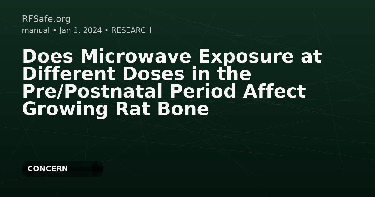 Does Microwave Exposure at Different Doses in the Pre/Postnatal Period Affect Growing Rat Bone Development? Karadayi A, Sarsmaz H, Çigel A, Engiz B, Ünal N, Ürkmez S, Gürgen S. Does Microwave Exposure at Different Doses in the Pre/Postnatal Period Affect Growing Rat Bone Development? Physiol Res. 2024 Mar 11;73(1):157-172. Abstract Effects of pre/postnatal 2.45 GHz continuous wave (CW), Wireless-Fidelity (Wi-Fi) Microwave (MW) irradiation on bone have yet to be well defined. The present study used biochemical and histological methods to investigate effects on bone formation and resorption in the serum and the tibia bone tissues of growing rats exposed to MW irradiation during the pre/postnatal period. Six groups were created: one control group and five experimental groups subjected to low-level different electromagnetic fields (EMF) of growing male rats born from pregnant rats. During the experiment, the bodies of all five groups were exposed to 2.45 GHz CW-MW for one hour/day. EMF exposure started after fertilization in the experimental group. When the growing male rats were 45 days old in the postnatal period, the control and five experimental groups' growing male and maternal rats were sacrificed, and their tibia tissues were removed. Maternal rats were not included in the study. No differences were observed between the control and five experimental groups in Receptor Activator Nuclear factor-kB (RANK) biochemical results. In contrast, there was a statistically significant increase in soluble Receptor Activator of Nuclear factor-kB Ligand (sRANKL) and Osteoprotegerin (OPG) for 10 V/m and 15 V/m EMF values. Histologically, changes in the same groups supported biochemical results. These results indicate that pre/postnatal exposure to 2.45 GHz EMF at 10 and 15 V/m potentially affects bone development. Excerpt In the present study, the effects of 2.45 GHz MW radiation on the bone of healthy rat tibia exposed to different doses of EMF during the prenatal and postnatal period were investigated using biochemical methods such as RANK, RANKL, OPG, and histopathological methods such as Tunel and immunohistochemical straining. Our findings showed that 2.45 GHz low-level MW radiation at 10 V/m (the peak SAR 10g value 14.4 mW/kg) and 15 V/m (the peak SAR 10g value 33.8 mW/kg) could cause changes in the bone. To our knowledge, our study seems to be the first investigation in literature focusing on effects on the bone of 2.45 GHz low-level MW radiation at different EMF values. Additionally, this research is the first article to determine the level of thermal and non-thermal effects on bone. Open access paper: biomed.cas.cz