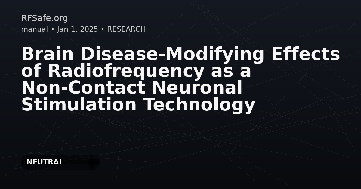 Brain Disease-Modifying Effects of Radiofrequency as a Non-Contact Neuronal Stimulation Technology Sun S, Bok J, Jang Y, Seo H. Brain Disease-Modifying Effects of Radiofrequency as a Non-Contact Neuronal Stimulation Technology. International Journal of Molecular Sciences. 2025; 26(5):2268. doi.org Abstract Non-invasive, non-contact, and painless methods of electrical stimulation to enhance neural function have been widely studied in recent years, particularly in the context of neurodegenerative diseases such as Alzheimer’s disease (AD) and related dementias, which cause cognitive decline and other neurological symptoms. Radiofrequency (RF), which is a rate of oscillation in the range of 3 kHz to 300 GHz (3 THz), has been suggested as one potential non-contact neuronal stimulation (NCNS) technique for improving brain function. A new type of electrical stimulation uses a radiofrequency electromagnetic field (RF- EMF). RF exposure has been shown to modulate neural stimulation and influence various brain activities in in vitro and in vivo models. Recent studies have explored the effects of RF-EMF on human physiology, particularly in areas such as brain activity, cognition, and sleep behavior. In this review, we summarize recent findings about the effects of non-contact stimulations in in vitro studies, in vivo animal models, and human clinical cases. Open access paper: mdpi.com