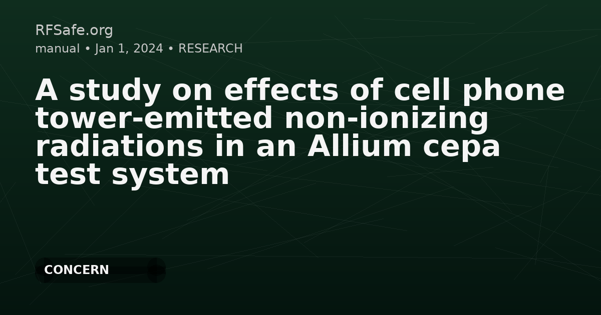 A study on effects of cell phone tower-emitted non-ionizing radiations in an Allium cepa test system Sharma A, Sharma S, Bahel S, Katnoria JK. A study on effects of cell phone tower-emitted non-ionizing radiations in an Allium cepa test system. Environ Monit Assess. 2024 Feb 13;196(3):261. doi: 10.1007/s10661-024-12435-2. Abstract Considering enormous growth in population, technical advancement, and added reliance on electronic devices leading to adverse health effects, in situ simulations were made to evaluate effects of non- ionizing radiations emitted from three cell phone towers (T1, T2, and T3) of frequency bands (800, 1800, 2300 MHz), (900, 1800, 2300 MHz), and (1800 MHz), respectively. Five sites (S1–S5) were selected near cell phone towers exhibiting different power densities. The site with zero power density was considered as control. Effects of radiations were studied on morphology; protein content; antioxidant enzymes like ascorbate peroxidase (APX), superoxide dismutase (SOD), glutathione-S-transferase (GST), guaiacol peroxidase (POD), and glutathione reductase (GR); and genotoxicity using Allium cepa. Mean power density (μW/cm2 ) was recorded as 1.05, 1.18, 1.6, 2.73, and 12.9 for sites 1, 2, 3, 4, and 5, respectively. A significant change in morphology, root length, fresh weight, and dry weight in Allium cepa was observed under the exposure at different sites. Protein content of roots showed significant difference for samples at all sites while bulbs at sites S4 and S5 when compared to control. Antioxidant activity for root in terms of APX, GST, and POD showed significant changes at S4 and S5 and GR at site S5 and SOD at S1, S2, S3, S4, and S5. Similarly, bulbs showed significant changes at sites S4 and S5 for APX while at sites S3, S4, and S5 for POD and S2, S3, S4, and S5 for SOD and S5 for GR and GST. Genotoxicity study has shown induction of abnormalities at different stages of the cell cycle in Allium cepa root tips. The samples under exposure to radiation with maximum power density have shown maximum induction of oxidative stress and genotoxicity. pubmed.ncbi.nlm.nih.gov Excerpts Specific locations with cell phone towers were identified using the Tarang Sanchar portal. The power density (μW/cm2 ) at different sites near towers was noted manually using an electromagnetic radiation detector (model: PCE-EM 29; make: PCE instruments, UK). Five sites were selected following the criteria of high-power density exposure and site with convenient experimental setup. Cell phone towers emitting radiations of different frequency bands, viz., 800, 1800, and 2300 MHz, for Reliance Jio 900, 1800 and 2300 MHz for Airtel, and 1800 MHz for Vodafone Idea (VI), were located at the sites of experiment. Depending upon the distance from the cell towers, five sites near towers showed the increasing order of their power density with decreasing distance. Site 1 showed a mean power density of 1.05 μW/cm2 at a distance of 20 m from cell towers, with an angle of ∠16.67°. Meanwhile, site 2 recorded a mean power density of 1.18 μW/cm2 at a distance of 15 m, with an angle of ∠21.77°. Site 3 exhibited a mean power density of 1.6 μW/cm2 at a distance of 10 m and an angle of ∠30.94°. Site 4 showed a mean power density of 2.73 μW/cm2 at a distance of 5 m and an angle of ∠50.19°. In contrast, site 5 displayed a higher mean power density of 12.9 μW/cm2 at distance of 1 m and an angle of ∠80.21° with an average temperature recorded to be 20–24 °C and relative humidity of 45–50%. The specifics regarding the selection of the exposure sites are provided in Fig. 1. Keeping all other environmental conditions constant and altering only one parameter that is power density, the site with zero power density is designated as the control at a distance of 50 m and an angle of ∠6.818°. Conclusion The present study clearly revealed that plant samples under exposure to electromagnetic radiations generated from cell phone towers at varied frequencies and maximum power densities had altered morphological and biochemical characteristics. The enhanced level of antioxidative enzymes like APX, GST, GR, POD, and SOD during the present study indicate the enhancement of oxidative stress and genotoxicity. The harmful effects of exposure to non-ionizing radiations were also witnessed through reduced protein content in test samples as compared to that of control. The genotoxicity studies revealed that the damage by exposure to radiations was high for root samples as compared to bulb samples indicating that root tip cells of Allium cepa were sensitive bioindicators to reveal toxicity of radiation pollution. This study is the first of its kind conducted in the field and reveals that further advance research is the need of an hour for in-depth understanding and devising the effective protective measures for mitigation of the detrimental effects of radiations.