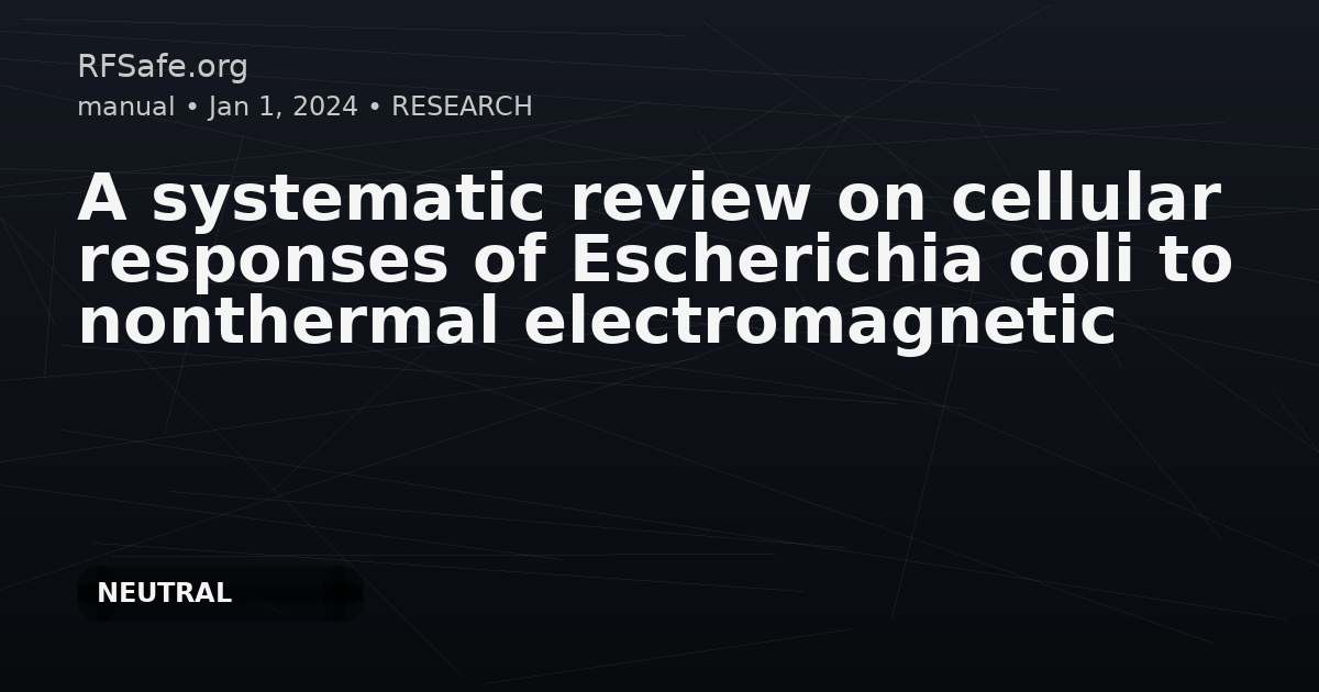 A systematic review on cellular responses of Escherichia coli to nonthermal electromagnetic irradiation Askaripour K, Żak A. A systematic review on cellular responses of Escherichia coli to nonthermal electromagnetic irradiation. Bioelectromagnetics. 2024 Jan;45(1):16-29. doi: 10.1002/bem.22484. Highlights • The present review aims to systematically evaluate literature to reach a firm conclusion on the causality between nonthermal electromagnetic radiation of alternating current and biological effects in Escherichia coli. • The systematic review methodology by OHAT and the risk of bias tool evaluating the validity of experimental design and conduct within research works were followed. • With 25 of the 114 records screened meeting the eligibility criteria, the evidence summation was performed regarding growth rate, morphology, and gene expression under exposure of extremely low frequency, intermediate frequency, or radio frequency. • With 85% of experiments in the included studies focusing on the extremely low-frequency range, effects on growth rate, morphology, and gene expression were supported in 74%, 80%, and 33% of the experiments, respectively. Abstract Investigation of Escherichia coli under electromagnetic fields is of significance in human studies owing to its short doubling time and human-like DNA mechanisms. The present review aims to systematically evaluate the literature to conclude causality between 0 and 300 GHz electromagnetic fields and biological effects in E. coli. To that end, the OHAT methodology and risk of bias tool were employed. Exponentially growing cells exposed for over 30 min at temperatures up to 37∘C with fluctuations below 1∘C were included from the Web-of-Knowledge, PubMed, or EMF-Portal databases. Out of 904 records identified, 25 articles satisfied the selection criteria, with four excluded during internal validation. These articles examined cell growth (11 studies), morphology (three studies), and gene regulation (11 studies). Most experiments (85%) in the included studies focused on the extremely low-frequency (ELF) range, with 60% specifically at 50 Hz. Changes in growth rate were observed in 74% of ELF experiments and 71% of radio frequency (RF) experiments. Additionally, 80% of ELF experiments showed morphology changes, while gene expression changes were seen in 33% (ELF) and 50% (RF) experiments. Due to the limited number of studies, especially in the intermediate frequency and RF ranges, establishing correlations between EMF exposure and biological effects on E. coli is not possible. pubmed.ncbi.nlm.nih.gov Conclusions The present review systemically evaluates whether the current literature, passing through the risk of bias tool, while fulfilling the selection criteria defined in the PECO statement, supports an association between nonthermal electromagnetic fields and alterations in the biological composition and functioning of E. coli strains. The findings from the 21 included studies are dependent on the specific endpoints assessed, which include cell growth, morphology, and gene expression. The conclusions are subject to certain limitations, as the review focuses on exponentially growing strains that were exposed to nonthermal EMFs of frequencies 0–300 GHz for a minimum duration of 30 min. In each study, it is possible that multiple experiments were conducted. Among these studies, 85% of experiments (16 articles) focused on the extremely low-frequency range, with 60% specifically examining 50 Hz. Additionally, 5% of experiments (one article) addressed the IF range, while 10% of experiments (four articles) addressed the RF range. In the investigation of nonthermal effects of extremely low-frequency electromagnetic fields (ELF-EMF), 74% of the experiments supported the effects on growth rate (investigated in nine articles), 80% supported the effects on morphology (investigated in three articles), and 33% supported the effects on gene expression (investigated in eight articles). Within the IF range, nonthermal effects on growth rate were observed in 100% of experiments (conducted in one article), but no experiments supported such effects on gene expression (investigated in one article). In the RF range, 71% of experiments supported nonthermal effects on growth rate (conducted in two articles), while 50% supported nonthermal effects on gene expression (conducted in two articles). Therefore, due to the limited number of studies available on the IF and RF ranges, the reliability of the results may primarily apply to ELF-EMF, particularly at 50 Hz. When experiments demonstrated biological effects, the observed pattern varied as either beneficial or detrimental, depending on the exposure conditions and experimental setup. For example, out of 38 experiments on growth rate, 12 showed beneficial effects while 16 showed detrimental effects. This controversy can be explained by the concept of the biological window, in which EMF may contribute to positive physiological processes. However, if the accumulated exposure exceeds the cell-specific energy limit, detrimental effects may prevail. Several sources exhibited inconsistencies when observing these effects. In terms of exposure parameters, continuity, referring to intermittent or continuous status, had a significant effect on the results, with pulsed signals showing a greater impact compared to sinusoidal signals. Extremely low frequencies and radio frequencies had a major impact on the investigated endpoints, while intermediate frequencies have received limited research attention. The intensity and duration of exposure influenced the absorbed energy levels, resulting in varying effects ranging from beneficial to neutral or detrimental. Modulation may introduce significant differences compared to unmodulated signals, depending on the modulation frequency. The optimal measurement time point depends on the specific endpoint and necessitates mechanistic understanding for accurate identification.