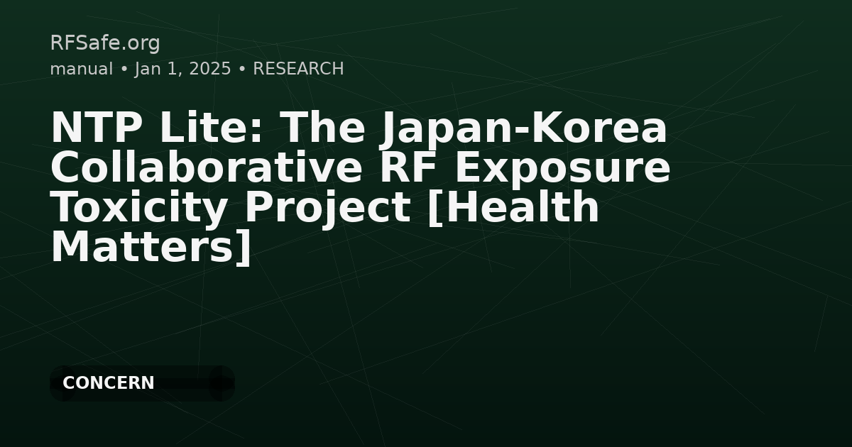 "summary": "This magazine article reviews the Japan-Korea \"NTP Lite\" RF animal toxicity collaboration and its relationship to prior NTP (2018) and Ramazzini Institute reports of RF-associated tumors in male rats. It notes NTP Lite used a single whole-body SAR of 4 W/kg and completed a two-year exposure phase in 2022, but final reporting is delayed with histopathology and genotoxicity work ongoing. The author highlights protocol harmonization across labs while raising concerns about unexplained animal deaths and physiological differences in exposed groups, and frames the broader evidence as supportive of RF-related cancer risk in laboratory animals.",