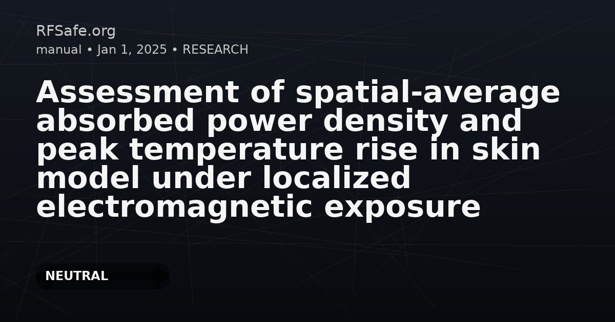 Category: Biophysics, Dosimetry Tags: EMF exposure, skin dosimetry, spatial-average absorbed power density, temperature rise, vasculature modeling, body tissues, 3-30 GHz DOI: 10.1093/rpd/ncaf096 URL: pubmed.ncbi.nlm.nih.gov Overview This study investigates the spatial-average absorbed power density (APD) and temperature rise in human skin models subjected to localized electromagnetic field (EMF) exposure. The research employs advanced numerical dosimetry using multi-layer models that include critical tissue components such as skin, fat, and muscle. Methods - Developed a synthetic blood vessel model and integrated it within multi-layer skin constructs. - Performed electromagnetic computations over a frequency range of 3 to 30 GHz. - Evaluated steady-state temperature increase using the Pennes bioheat transfer equation. - Compared simulations both with and without vasculature variations and assessed different endpoint diameters. Findings - Effect of vascular modeling on peak spatial-averaged APD was found to be negligible. - Influence on peak temperature rise due to vasculature was ~8% at 3 GHz, dropping below 3% above 6 GHz. - Endpoint diameter effect was marginal on both APD and peak temperature rise. - Observed variations were smaller than those caused by changes in tissue thickness, dielectric, or thermal properties. Conclusion Although the impact of vasculature on EMF-induced temperature increase is modest, its inclusion refines the accuracy of localized thermal distribution predictions. This suggests that future anatomical modeling for EMF safety should consider detailed vascular representation for enhanced dosimetry precision.