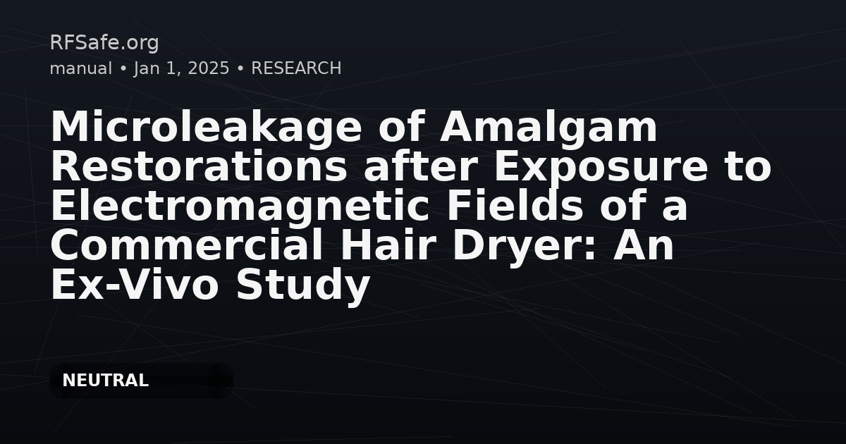 Category: Dentistry, Electromagnetic Field Safety, Experimental Research Tags: amalgam, microleakage, electromagnetic fields, hair dryer, dental restoration, EMF safety, ex-vivo study DOI: 10.31661/jbpe.v0i0.2210-1551 URL: jbpe.sums.ac.ir Overview Dental amalgam remains a widely used restorative material for posterior teeth. However, modern electrical appliances such as hair dryers emit electromagnetic fields (EMFs) which may impact the amalgam-tooth interface, potentially increasing microleakage. Objective This experimental study aimed to determine if EMFs produced by commercial hair dryers can affect the microleakage of amalgam restorations. Methods - 100 human extracted teeth were prepared with class V cavities on their buccal aspects. - Teeth were randomized into five groups (G1-G5, 20 per group). - Group 1 (control) received no treatment, while Groups 2-5 were exposed to EMFs from a 2000W hair dryer at 220V/50Hz under varying "Hot Air" and "Cool Air" protocols and distances. - Microleakage was quantified using dye penetration measurement. Findings - Groups G2, G3, and G5, which were exposed to EMFs, showed significantly higher microleakage scores compared to the control (P=0.001, 0.002, and 0.01). - G4 did not show a significant difference from the control. - G2 (Hot Air/10cm/20min) had greater microleakage than G4 (Cool Air/10cm/20min). Conclusion This study demonstrates a clear link: EMFs from commonly used devices like hair dryers can induce increased microleakage in dental amalgam restorations, compromising dental health and restoration integrity. It is important to recognize that everyday EMF exposure can pose real health risks in dental materials.