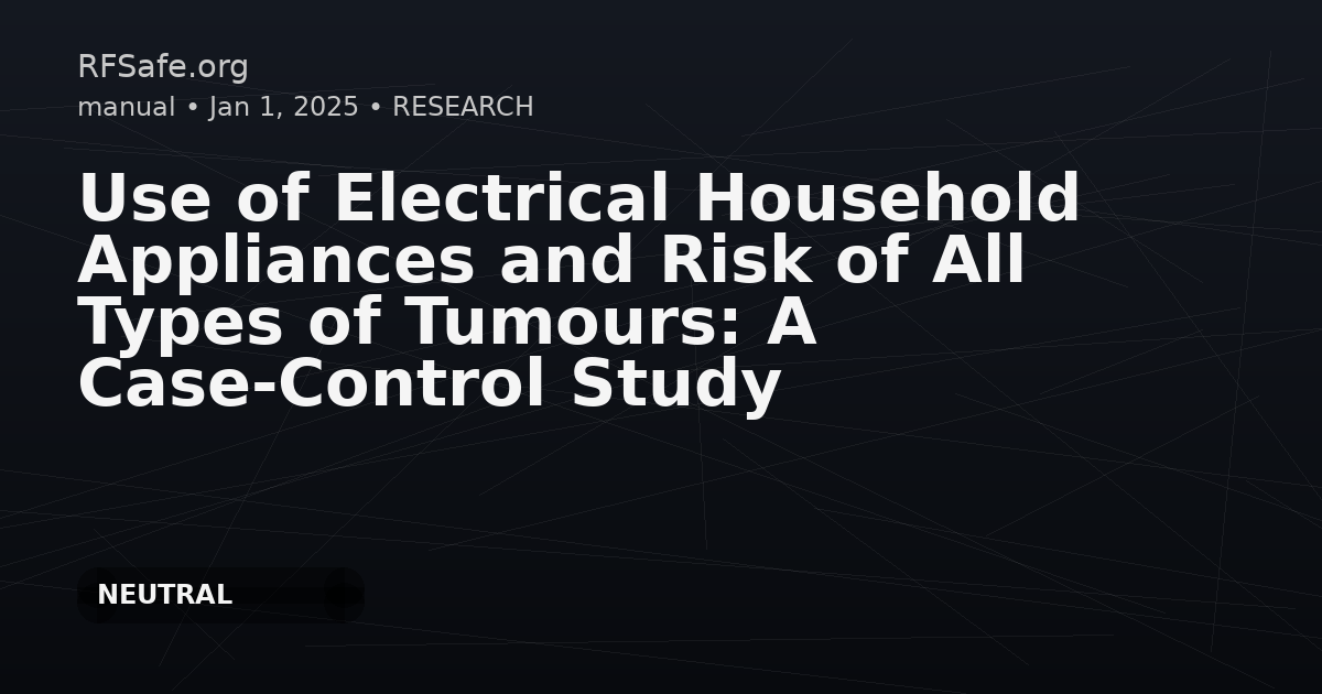 Category: Epidemiology Tags: EMF, ELF, household appliances, tumour risk, case-control, powerlines, transformer station DOI: 10.3390/medsci13020036 URL: mdpi.com Overview The use of electrical appliances that emit extremely low frequency (ELF) electromagnetic fields (EMF) is increasing globally. These fields have been reported to be associated with several adverse health effects, and the potential link between risk of tumours and use of electronic devices emitting low frequency (LF) EMF is an important area for research. Methods - This multi-hospital-based case-control study analyzed 316 patients to investigate the association of common household electrical appliance use and risk of tumours. Findings - The study showed a below unity risk for most devices. - Slightly increased risk of tumour was observed for computer screen use (Odds Ratio [OR]: 1.13; 95% CI: 0.43-3.02). - Similar increased risk seen for microwave oven use (OR: 1.21; 95% CI: 0.36-4.04). - Significantly, individuals living near electricity transformer stations had a statistically significant elevated risk of tumours (OR: 2.16; 95% CI: 1.30-3.59), clearly indicating a connection between ELF EMF exposure and increased tumour risk. - In contrast, individuals living close to powerlines had an OR of 0.98, suggesting no elevated risk in that subgroup. Conclusion This pilot study provides primary data suggesting certain household EMF exposures, especially proximity to transformer stations, may be associated with an increased risk of tumours. This underlines the need for further epidemiological research on EMF safety and health risks.