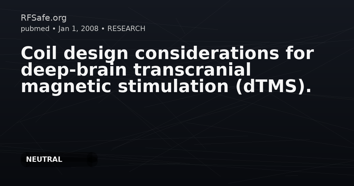 "main_findings": "Figures of merit were proposed to compare dTMS coil designs, and two configurations (circular crown coil and C-core coil) were analyzed. Both coils were reported to have less attenuation of electric field strength at depth than conventional TMS coils; simulations suggested the crown coil had the best overall performance. Charge density and heating in the brain were described as being at safe levels, while risks of unintended neuromodulation and seizures were noted as requiring further evaluation.",