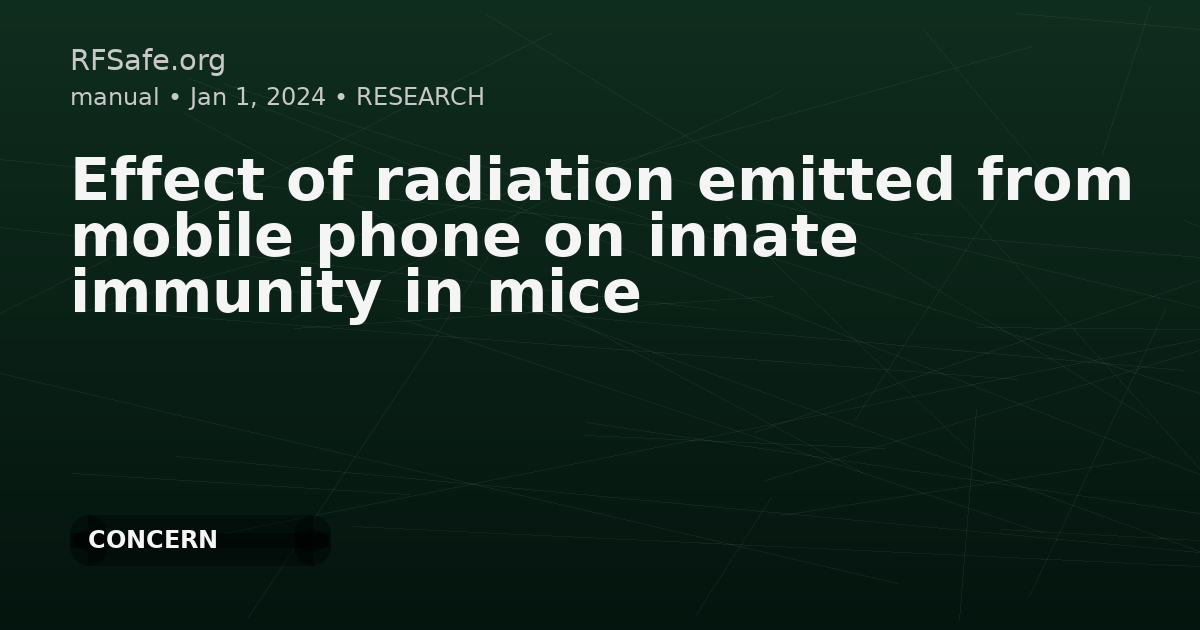 Effect of radiation emitted from mobile phone on innate immunity in mice Pei, Y., Gao, H., Zhang, M., Zhou, F., Zhu, Y., Wang, X., & Sun, J. (2024). Effect of radiation emitted from mobile phone on innate immunity in mice. Radiation Effects and Defects in Solids, 179(11–12), 1585– 1596. doi: 10.1080/10420150.2024.2352845 Abstract This present study aims to explore the potential impact of cell phone radiation on innate immunity in mice. Ninety-six male BALB/C mice aged 2–3 weeks were randomly distributed into 4 groups as blank control, control, TD-SCDMA and LTE-Advanced respectively, with 32 mice in each group. Mice were designed to be exposed to cell phone radiation for 4–8 weeks. Eight mice in each group were taken out for measurement given exposure periods were 4, 6 and 8 weeks respectively. Cell biological technique was conducted to assess the chemotaxis of neutrophils, and a morphological method was performed for the detection of phagocytosis of neutrophil and macrophage, while microbiological means was carried out to test the relative activity of lysozyme in serum of mice. As a result, the chemotaxis ratio of neutrophils was with little statistical difference among the four groups given a shorter exposure period. However, the ratios in TD-SCDMA and LTE-Advanced groups were decreased significantly on the condition that the exposure period was more than 6 weeks. No statistical difference was observed among the four groups during the entire exposure period in terms of the chemotaxis index. Phagocytosis of the innate cells as neutrophil and macrophage showed little change in the two control groups during the whole experimental stages, while the percentage in the two treated groups decreased statistically, and this kind of reduction was prone to feature time dependence. The activities of lysozyme in TD-SCDMA and LTE-Advanced groups declined significantly, further to that, the impact was climbing paralleled with the prolonged duration. It could be deduced that radiation from cell phones could weaken innate immunity in experimental mice; moreover, this adverse effect was seemingly more severe as the radiation exposure continued. tandfonline.com