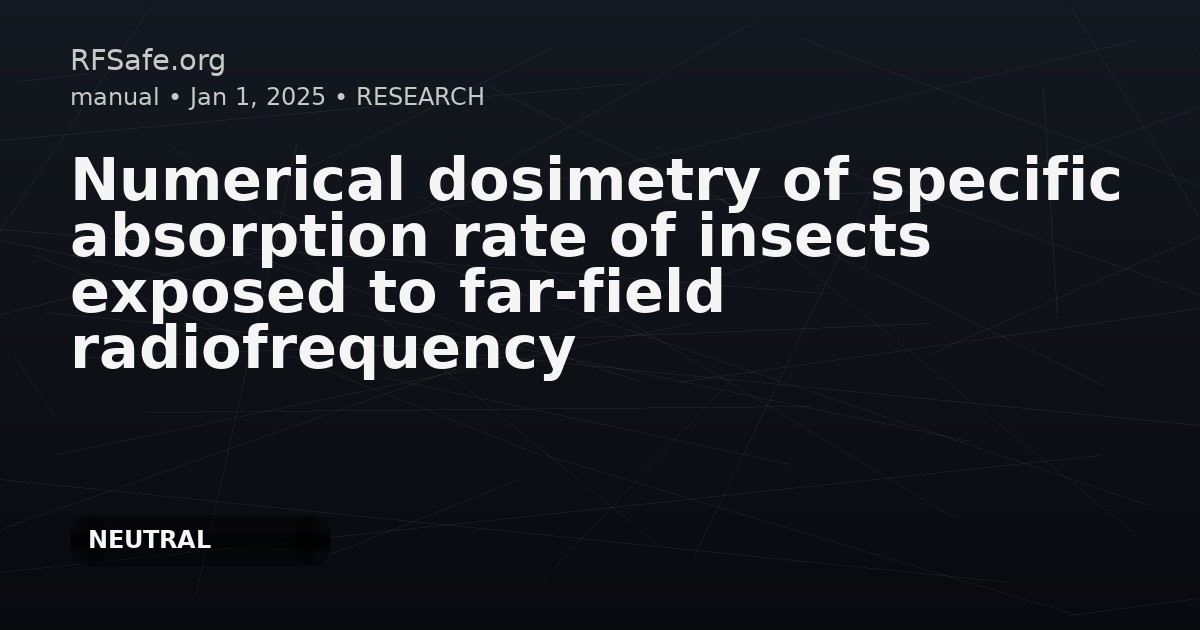 Numerical dosimetry of specific absorption rate of insects exposed to far-field radiofrequency electromagnetic fields Jeladze V, Nozadze T, Partsvania B, Thielens A, Shoshiashvili L, Gogoladze T (2025). Numerical dosimetry of specific absorption rate of insects exposed to far-field radiofrequency electromagnetic fields. International Journal of Radiation Biology, 1–14. doi: 10.1080/09553002.2024.2442693. Abstract Purpose This paper reports a study of electromagnetic field (EMF) exposure of several adult insects: a ladybug, a honey bee worker, a wasp, and a mantis at frequencies ranging from 2.5 to 100 GHz. The purpose was to estimate the specific absorption rate (SAR) in insect tissues, including the brain, in order to predict the possible biological effects caused by EMF energy absorption. Method Numerical dosimetry was executed using the finite-difference time-domain (FDTD) method. Insects were modeled as 3-tissue heterogeneous dielectric objects, including the cuticle, the inner tissue, and the brain tissue. The EMF source was modeled as sinusoidal plane waves at a single frequency (far-field exposure). Results The whole-body averaged, tissue averaged, and 1 milligram SAR values were determined in insects for all considered frequencies for 10 different incident plane waves. SAR values were normalized to the incident power density of 1 mW/cm2. Maximal EMF absorption in the inner and brain tissues was observed at 6, 12, and 25 GHz for the considered insects, except the brain tissue of a ladybug (max at 60 GHz). Conclusion The paper presented the first estimation of the SAR for multiple insects over a wide range of RF frequencies using 3-tissue heterogenous insect 3D models created for this specific research. The selection of tissues’ dielectric properties was validated. The obtained results showed that EMF energy absorption in insects highly depends on frequency, polarization, and insect morphology. Conclusion The paper presented a study of RF-EMF dosimetry of honeybee worker, wasp, mantis, and ladybug from 2.5 to 100 GHz, including frequencies that will be utilized in future 5 G technologies. Discrete, 3-tissue heterogenous insect 3D models were created and used for FDTD modeling. The whole-body averaged SAR values and tissue-averaged SAR values were estimated in insects’ tissues for 9 considered frequencies and 10 polarizations of incident plane wave. For the first time, 1 mg SAR values were determined in insect tissues. The obtained results showed SAR values in honeybee, wasp, ladybug, and mantis body tissues, which depend on the direction of the incident plane wave and polarization, frequency, and the insects’ body sizes and peculiarities. The highest values of the peak 1 mg SAR for the honeybee and wasp − 39.2 W/kg and 169.2 W/kg for an incident field strength of 1 mW/cm2 , were observed when E-field polarization was directed along the insect’s length (pol. E3, E5, E9). The obtained results showed maximal tissue-specific SAR values in the brain at 25 GHz for the honeybee (3.6 W/kg), 12 GHz for the wasp (5.4 W/kg), 25 GHz for the mantis (5.2 W/kg), and 60 GHz for the ladybug (10 W/kg), all for an incident power density of 1 mW/cm2 . Maximal EMF absorption in the inner tissue was observed at 12 GHz, 4.3 W/kg, 5.9 W/kg, 4.8 W/kg for the honey bee, wasp, and ladybug, respectively, and for the mantis 3.3 W/kg at 6 GHz for an incident power density of 1 mW/cm2 . The absorption in insects’ cuticles increased proportionally with frequency. For example, for the ladybug, the tissue-specific SAR in the cuticle was 0.1 W/kg at 2.5 Ghz and 11.9 W/kg at 100 GHz for the same incident power density of 1 mW/cm2 . Future studies will consider introducing insect models that will be obtained using micro-CT scanning, examining the effects of high-frequency electromagnetic fields on other insects of different forms and sizes, conducting thermal simulations along with EM simulations, and evaluating temperature rise in insect tissues. Based on the present results, we expect this research to have an impact on (environmental) policymaking and standardization and regulation regarding RF-EMF emissions. We expect to contribute to the harmonization of 5G EMF safety and compliance doses and to the development of future recommendations about safe frequencies and doses of 5G-EMF on the organisms studied in the present research. tandfonline.com