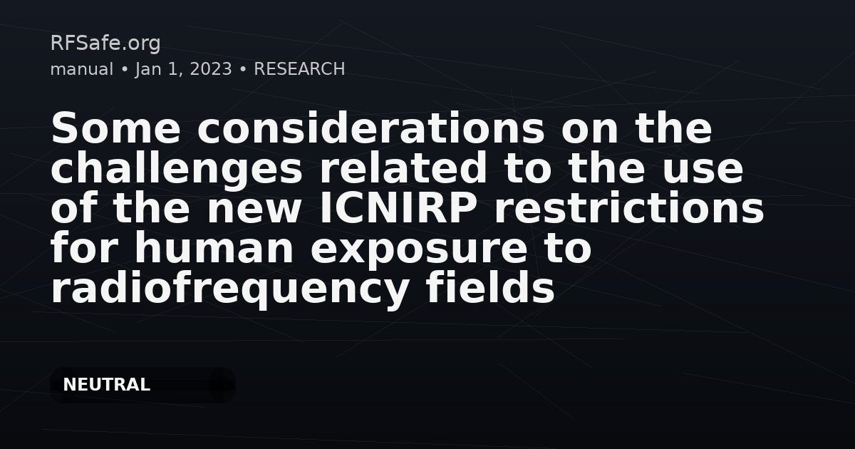 Some considerations on the challenges related to the use of the new ICNIRP restrictions for human exposure to radiofrequency fields Goiceanu C, Danulescu R, Danulescu E. Some considerations on the challenges related to the use of the new ICNIRP restrictions for human exposure to radiofrequency fields. Radiat Prot Dosimetry. 2023 May 24;199(8- 9):818-825. doi: 10.1093/rpd/ncad084. Abstract ICNIRP 2020 guidelines for limiting exposure to radiofrequency fields replace the radiofrequency part of the ICNIRP 1998 guidelines for limiting exposure to time-varying electric, magnetic and electromagnetic fields. Besides setting new restrictions that prevent thermal effect they also took over the 100 kHz to 10 MHz part of the ICNIRP 2010 guidelines for limiting exposure to low-frequency electromagnetic fields, which provides restrictions that prevent nerve stimulation effect. The latest guidelines brought many changes to the system of protection against exposure to radiofrequency fields starting with the physical quantities used to express restrictions and continuing with specific restrictions and new exposure metrics employed. For the first time, the case of brief local exposure to intense radiofrequency fields was accounted by ICNIRP for setting new types of exposure restrictions. All these changes led to more detailed and complex guidelines, but their provisions are more difficult to apply in practice. Our paper presents some of the challenges related to the use in practice of the new ICNIRP restrictions for human exposure to radiofrequency fields. Excerpts In the domain of radio frequencies, two established effects are taken into account for setting exposure restrictions: thermal effect and nerve stimulation effect. To protect against thermal effect, the 2020 guidelines set basic restrictions in terms of Specific Absorption Rate (SAR) assessed as whole-body average (WBA), as well as local SAR in head and torso or in limbs. At frequencies above 6 GHz, basic restrictions were set for local absorbed power density (Sab) to account for heating localized at the surface of the body. These exposure limits have the same values as those used in previous guidelines from 1998, except the local absorbed power density limit that restricts the superficial heating at high frequencies. The new values of basic restriction for power density of 100 W m−2 for occupational exposure and of 20 W m−2 for general public exposure are twice the limit values set by 1998 guidelines. However, the reader should keep in mind that the new restrictions refer to absorbed power density, which is a measure of exposure of the body, while the old restrictions from 1998 concern the incident power density (Sinc) which is a parameter of the external field. The different values of the new basic restrictions are due to the decreased averaging area from 20 to 4 cm2 to match the face of the averaging volume (10 g) of SAR, and, therefore, the new restrictions on power density provide a consistent transition at 6 GHz(8). In addition to previous guidelines, the latest guidelines also included new types of restrictions to protect against brief local exposure to intense fields. For exposures lasting < 6 minutes, basic restrictions in terms of local specific absorption (SA), and absorbed energy density (Uab) were set. Moreover, the new guidelines also take into account the nerve stimulation effect and therefore, restrictions have been taken over from the ICNIRP 2010 guidelines on low-frequency electric and magnetic fields. Basic restrictions for nerve stimulation are expressed in terms of induced electric field strength and limit values are provided for frequencies between 100 kHz and 10 MHz. Conclusions The new ICNIRP 2020 guidelines are more detailed than previous guidelines and cover a wider range of exposure scenarios. New physical quantities and new metrics are used for setting restrictions on different types of exposure. Besides the whole-body exposure, the new radiofrequency guidelines provide reference levels for local exposure and brief intense local exposure. Although the guidelines are more comprehensive, their provisions might confuse the reader due to the complexity of changes, as well as the introduction of some new concepts and quantities that represents a challenge for practitioners who need to perform compliance evaluation. Considering the complexity and novelty of the new guidelines, training of personnel involved in measurement of radiofrequency field levels and evaluating compliance with exposure restrictions is needed. Besides additional information and advice on exposure restrictions and quantities expressing them, aspects related to practical determination of the new quantities or the use of new metrics should be approached. Guidance is needed on different technical issues as measurement of incident power density, especially within the radiative near-field zone, as well as averaging over 4 and 1-cm2 areas. For the determination of the newly introduced quantity, the incident energy density, clarification is needed on methods and equipment to use and how to process the measurement data. Moreover, between 100 kHz and 10 MHz, two sets of reference levels for both, electric and magnetic field strength, one set for thermal effect and the other one for nerve stimulation effect are provided and, consequently, guidance is necessary on the way to apply them. As the authors emphasized, generally one of the two sets of reference levels is more relevant for each electric or magnetic field strength. Further clarification is needed on which of the two types of reference level prevails and should be used when evaluating compliance in real exposure scenarios. The exact manner of measuring or calculating the physical quantities expressing all reference levels needs to be provided by relevant technical bodies. Standardized procedures should also take into account the characteristics of different types of sources and possible exposure scena