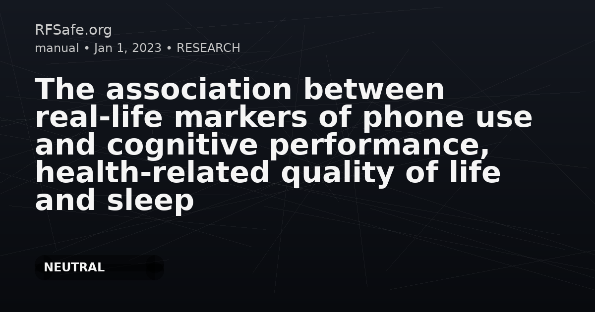 The association between real-life markers of phone use and cognitive performance, health-related quality of life and sleep Eeftens M, Pujol S, Klaiber A, Chopard G, Riss A, Smayra F, Flückiger B, Gehin T, Diallo K, Wiart J, Mazloum T, Mauny F, Röösli M. The association between real-life markers of phone use and cognitive performance, health- related quality of life and sleep. Environ Res. 2023 Apr 29:116011. doi: 10.1016/j.envres.2023.116011. Abstract Introduction: The real-life short-term implications of electromagnetic fields (RF-EMF) on cognitive performance and health-related quality of life have not been well studied. The SPUTNIC study (Study Panel on Upcoming Technologies to study Non-Ionizing radiation and Cognition) aimed to investigate possible correlations between mobile phone radiation and human health, including cognition, health-related quality of life and sleep. Methods: Adult participants tracked various daily markers of RF-EMF exposures (cordless calls, mobile calls, and mobile screen time 4 h prior to each assessment) as well as three health outcomes over ten study days: 1) cognitive performance, 2) health-related quality of life (HRQoL), and 3) sleep duration and quality. Cognitive performance was measured through six "game-like" tests, assessing verbal and visuo-spatial performance repeatedly. HRQoL was assessed as fatigue, mood and stress on a Likert-scale (1-10). Sleep duration and efficiency was measured using activity trackers. We fitted mixed models with random intercepts per participant on cognitive, HRQoL and sleep scores. Possible time-varying confounders were assessed at daily intervals by questionnaire and used for model adjustment. Results: A total of 121 participants ultimately took part in the SPUTNIC study, including 63 from Besancon and 58 from Basel. Self-reported wireless phone use and screen time were sporadically associated with visuo-spatial and verbal cognitive performance, compatible with chance findings. We found a small but robust significant increase in stress 0.03 (0.00-0.06; on a 1-10 Likert-scale) in relation to a 10-min increase in mobile phone screen time. Sleep duration and quality were not associated with either cordless or mobile phone calls, or with screen time. Discussion: The study did not find associations between short-term RF-EMF markers and cognitive performance, HRQoL, or sleep duration and quality. The most consistent finding was increased stress in relation to more screen time, but no association with cordless or mobile phone call time. pubmed.ncbi.nlm.nih.gov