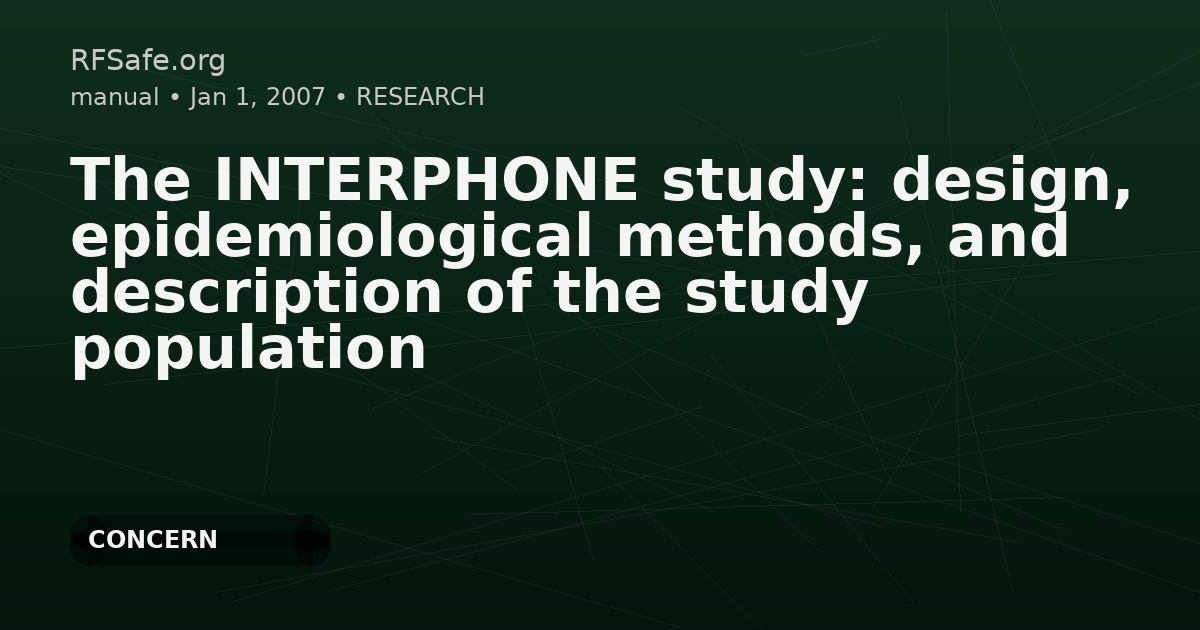 The very rapid worldwide increase in mobile phone use in the last decade has generated considerable interest in the possible health effects of exposure to radio frequency (RF) fields. A multinational case-control study, INTERPHONE, was set-up to investigate whether mobile phone use increases the risk of cancer and, more specifically, whether the RF fields emitted by mobile phones are carcinogenic. The study focused on tumours arising in the tissues most exposed to RF fields from mobile phones: glioma, meningioma, acoustic neurinoma and parotid gland tumours. In addition to a detailed history of mobile phone use, information was collected on a number of known and potential risk factors for these tumours. The study was conducted in 13 countries. Australia, Canada, Denmark, Finland, France, Germany, Israel, Italy, Japan, New Zealand, Norway, Sweden, and the UK using a common core protocol. This paper describes the study design and methods and the main characteristics of the study population. INTERPHONE is the largest case-control study to date investigating risks related to mobile phone use and to other potential risk factors for the tumours of interest and includes 2,765 glioma, 2,425 meningioma, 1,121 acoustic neurinoma, 109 malignant parotid gland tumour cases and 7,658 controls. Particular attention was paid to estimating the amount and direction of potential recall and participation biases and their impact on the study results. The Interphone Study was a large multinational case-control study coordinated by the International Agency for Research on Cancer (IARC) investigating the link between cell phone use and brain tumors, including glioma and meningioma. Conducted between 2000 and 2010 across 13 countries, it included over 5,000 cases. Heavy use was defined as more than 1,640 hours (approximately 30 minutes per week), revealing a potential increase in glioma risk among heavy users. However, this threshold is now considered trivially low compared to today's usage patterns, where individuals often use their devices for hours daily. Additionally, the study excluded children, a group now recognized as highly vulnerable to EMF exposure. Key Evidence Multinational Scope: Conducted in 13 countries with over 5,000 cases. Usage Threshold: Heavy use defined as >1,640 hours, now seen as low. Risk Identification: Identified increased glioma risk among heavy users. Study Limitations: Exclusion of children, a highly vulnerable group. Effect: HARM Brain tumors found in very low user groups compared to today (Only 30 Mins A Day)